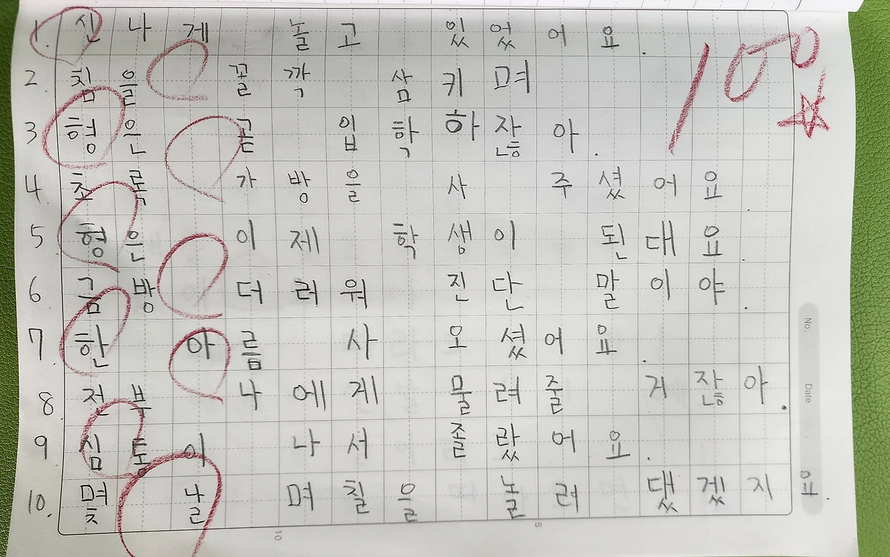 받아쓰기 연습은 주로 학교에서 한다. 1주일에 세 번 정도 배움 공책에 쓰고, 수요일에는 집에서 한 번 연습하고 온다. 하지만 절반은 학원에서 늦게 오는 등 안 해 오지만 괜찮다. 그래도 우리 반은 학업성취도가 높은 편이다. 80% 정도는 100점을 받고 보통 한두 개 정도 틀린다. 가장 많이 틀리는 학생이 3개 정도 틀린다. 받아쓰기는 따로 점수를 안 써주고 100점만 별을 그려준다.