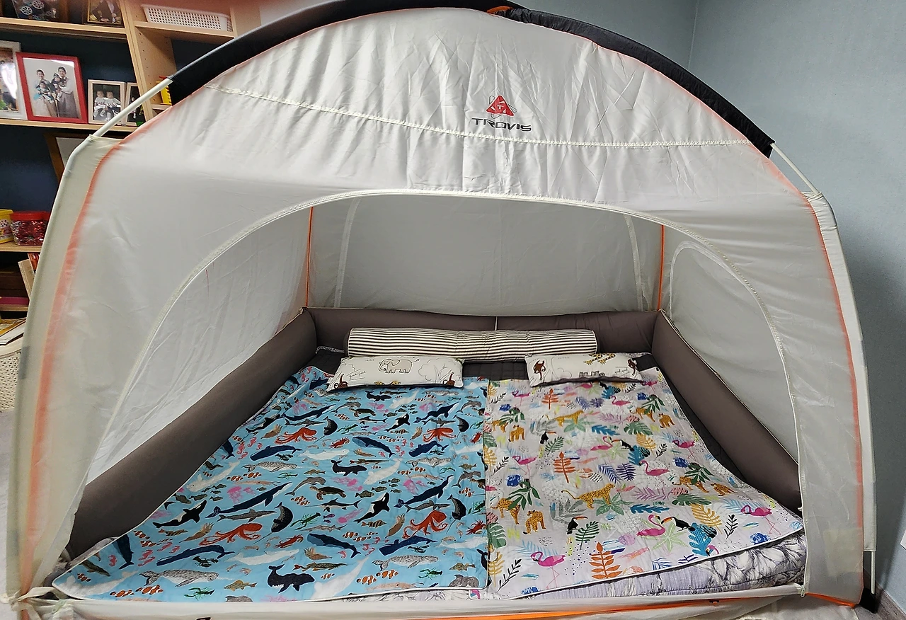 텐트 속에 누우면 마치 캠핑을 온 것처럼 기분이 좋다. 쌍둥이 손자도 텐트를 좋아한다. 텐트 속에 누워 잠들기 전에 세계 나라 이름 대기도 하고, 나무 이름 대기도 하며 행복하게 꿈나라로 간다.