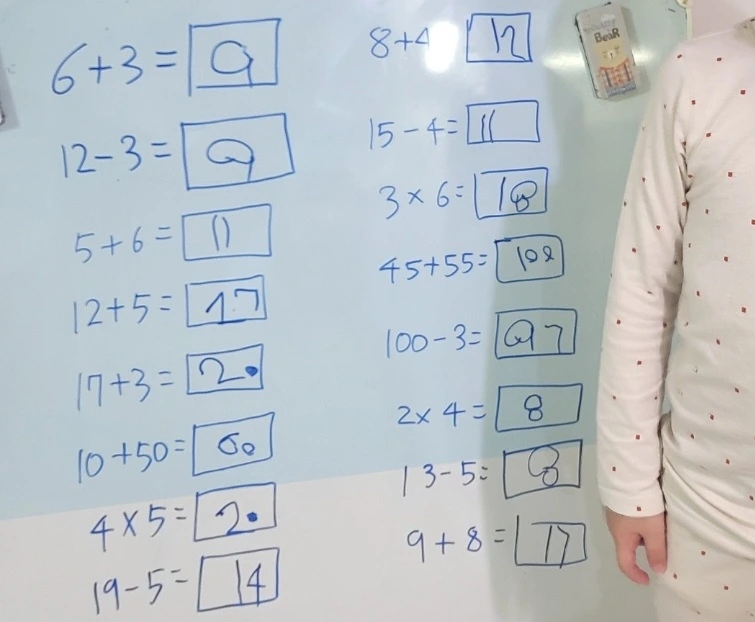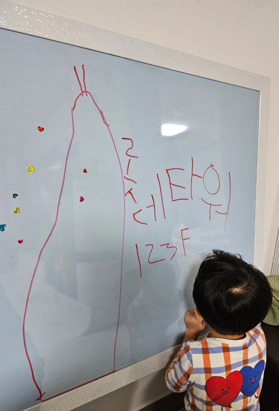 이제 칠판에 그림도 그려본다. 칠판에 아파트도 그리고더하기 공부도 한다. 오늘은 둘째가 봄에 다녀온 롯데타워를 그렸다. 123층 탑도 그린다.그림을 그리고 한글로 롯데타워라고 쓴다. 쌍둥이 손자는 세 돌 지나면서 한글을 읽었다. 쓰는 것은 다섯 살 되면서부터 시작하였다.