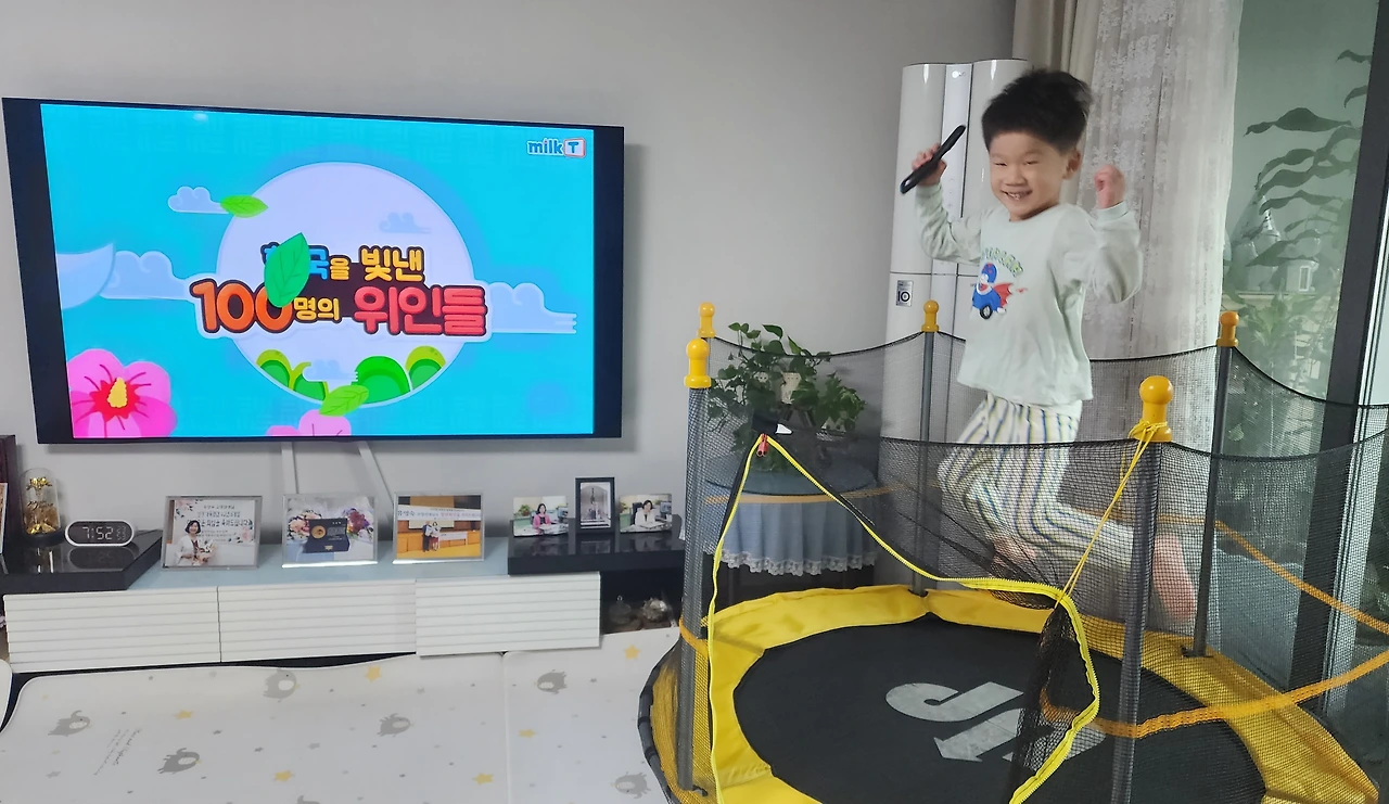 손자를 돌보며 손자 물건이 많아진다. 거실에 트램펄린이 있다. 가장 오래 사용하는 놀이기구다. 그네, 미끄럼틀은 세 살까지 놀다가 다른 사람에게 주었다. 요즘 둥이는 '한국을 빛낸 100인의 위인들' 노래에 빠졌다. 3절까지 100인을 다 외워서 노래 부른다. 유튜브를 틀고 트램펄린에서 뛰며 신나게 노래 부른다.