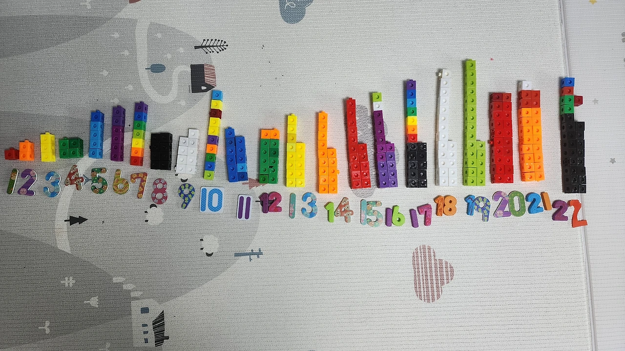 트램펄린에서 뛰다가 힘들면 블록을 가지고 논다. 쌍둥이 손자는 숫자를 좋아한다. 숫자 배열을 다 알아 만 자리까지 다 안다. 오늘은 블록으로 숫자를 만들어 본다. 나름 색깔도 규칙을 만들어 끼운다. 일곱은 항상 무지개색으로 만든다. 1부터 22까지 만들고 보니 숫자 2가 부족하여 마지막 2는 종이에 써서 오려주었다.