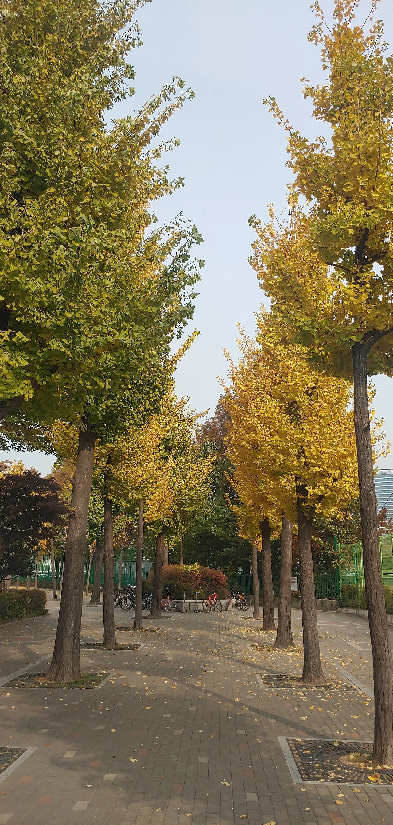 퇴직하기 전 학교 옆 아파트에 있는 은행나무 길이 가을이면 정말 예뻤다. 몇 번을 카메라에 담았다. 떨어져 쌓인 은행잎을 밟으며 산책하면 영화의 주인공처럼 행복했다. 가을이면 은행나무 길이 그립다.
