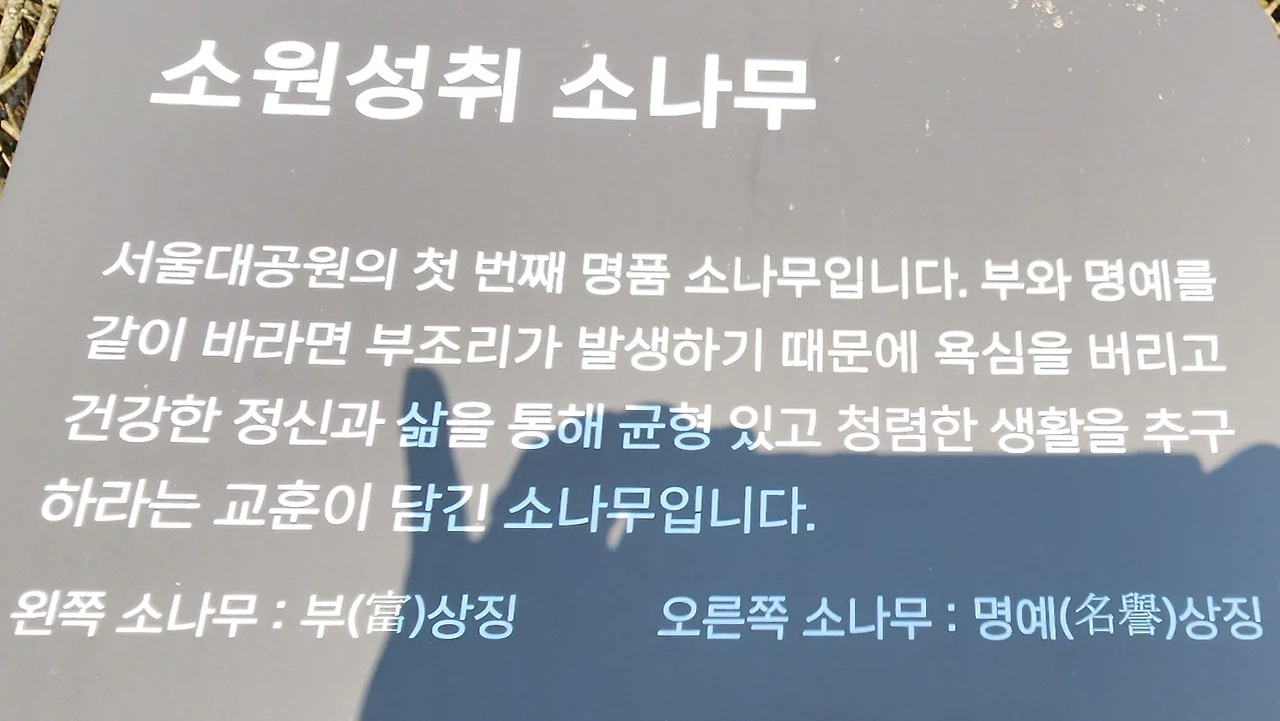 내려오는 길도 좋았다. 이구동성으로 봄에 오면 더 좋겠다고 하며 내년 3월 말쯤 한 번 더 오자고 했다. 다 내려왔는데 신기한 소나무 두 그루가 있었다. 대공원 소원성취 명품 소나무였다. 소나무가 각각 다른 방향을 보고 있었다.