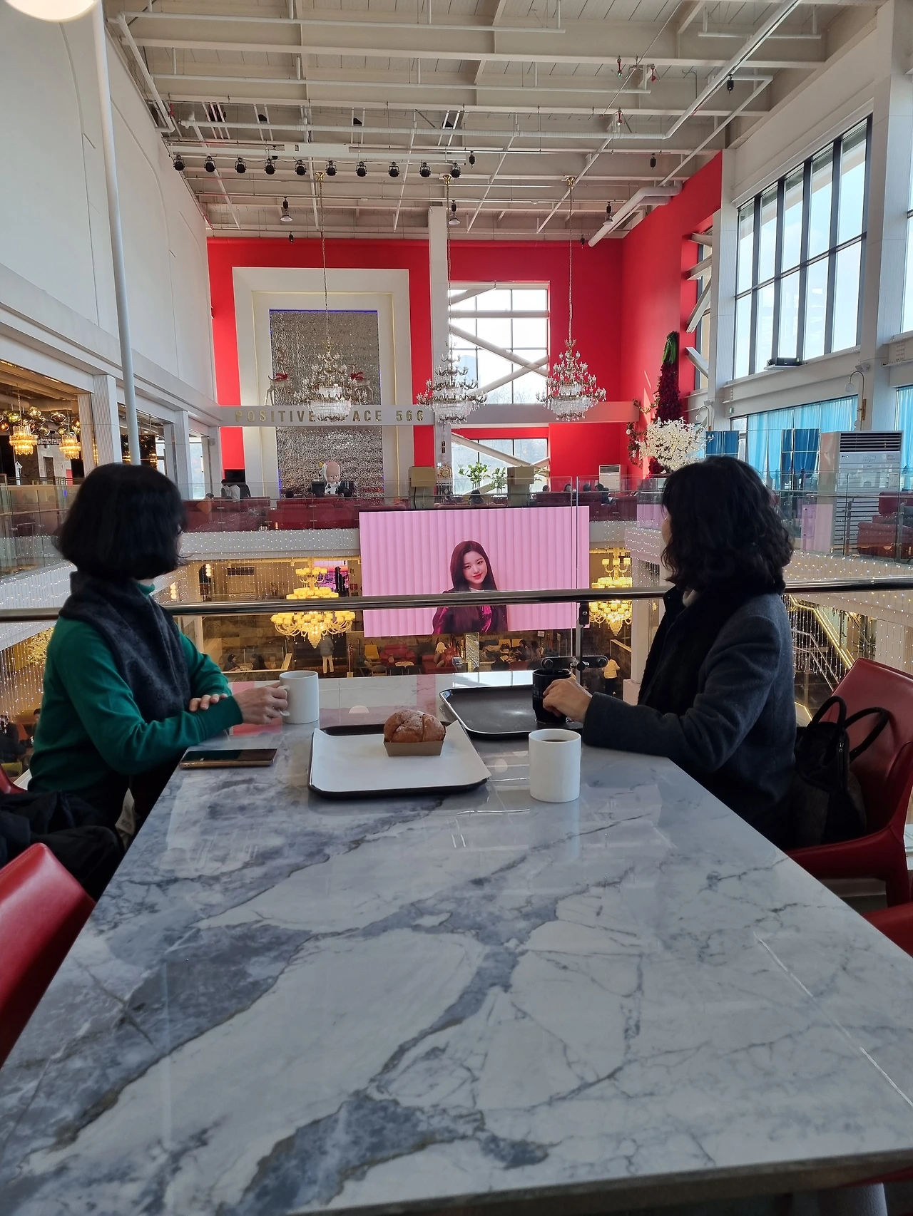 우리도 점심식사를 했지만, 맛있어 보이는 빵과 커피를 주문해서 엘리베이터를 타고 4층으로 올라갔다. 커피는 잠자는 것이 걱정되어 디카페인으로 주문했다. 적당한 곳에 자리를 잡았다. 자리는 테이블도 있었지만, 온돌방 같은 곳도 있고 계단식 자리 등 다양하였다. 자리가 다양하니 골라 앉는 재미도 쏠쏠할 것 같다. 좌석이 2,000석이 넘는다. 가운데 공간이 뻥 뚫려서 다른 층을 내려다볼 수 있고 대형 스크린도 볼 수 있었다.