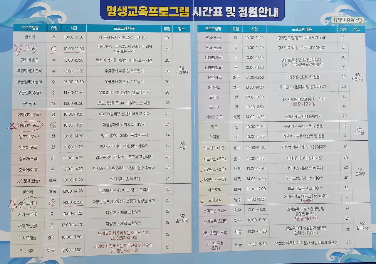 교육 프로그램 소책자를 받았다. 생각보다 프로그램이 많았다. 내가 하고 싶었던 시 낭송과 캘리그래피가 눈에 들어왔다. 동그라미를 크게 그려 두었다. 예전에 배운 적이 있어서 라인댄스도 하고 싶었는데 그것도 있다. 여행 영어 중급반에도 들어가서 손자랑 여행 갔을 때 영어도 잘하고 싶다. 2월 19일부터 노인 복지관에 직접 방문해서 신청하면 된다. 그날 잊지 말고 일찍 가서 신청해야겠다.