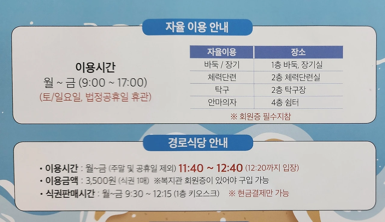 사무실에서 회원 가입하고 임시 회원증을 받았다. 회원증은 1주일 후에 찾으러 오라고 했다. 회원증이 나오면 탁구장이나 체력 단련실도 무료로 이용할 수 있고, 점심도 3,500원에 먹을 수 있다고 했다. 점심 먹으러 일부러 오진 않겠지만, 혹시 오전과 오후 교육이 함께 있는 날에는 이용해도 좋겠다는 생각이 들었다.