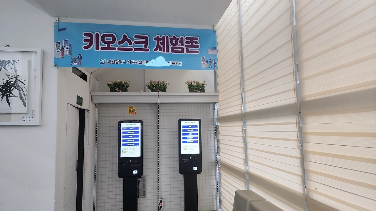 이제 두 정류장 정도 걸어서 노인 복지관에 도착했다. 1층에는 안내하는 어르신 두 분이 계셔서 회원 가입하러 왔다고 하니 2층 사무실로 가라고 했다. 계단 옆에 키오스크 체험 존도 있었다. 노인들에게 꼭 필요한 체험 교육이라는 생각이 들었다.