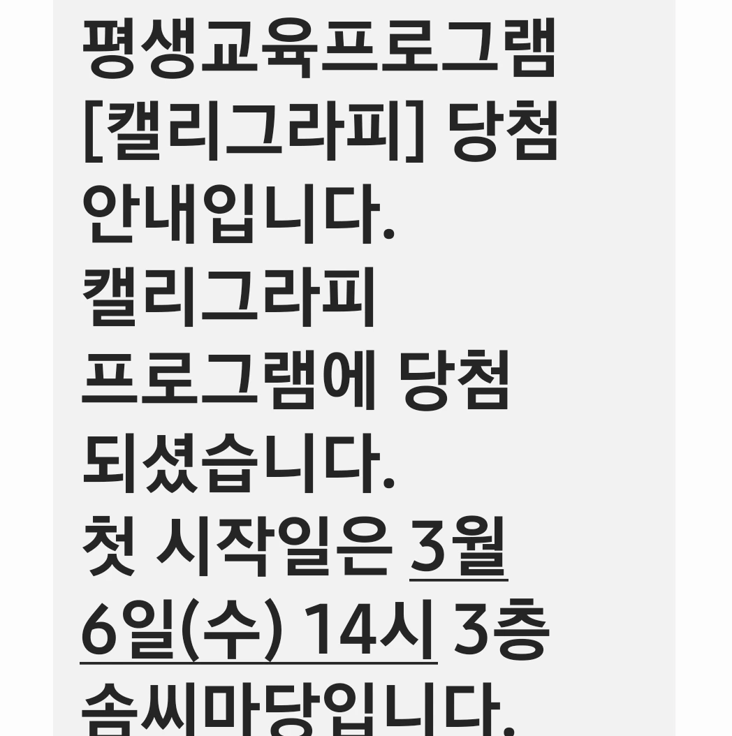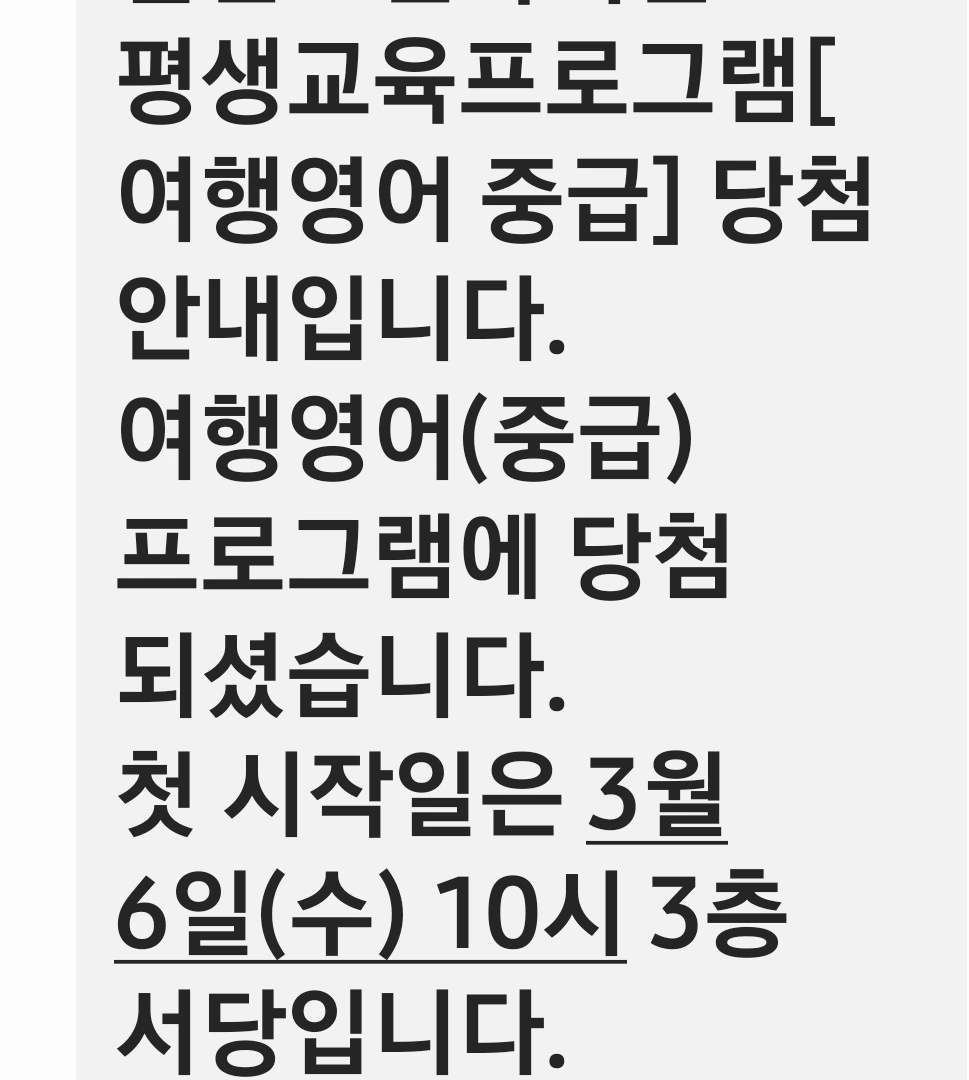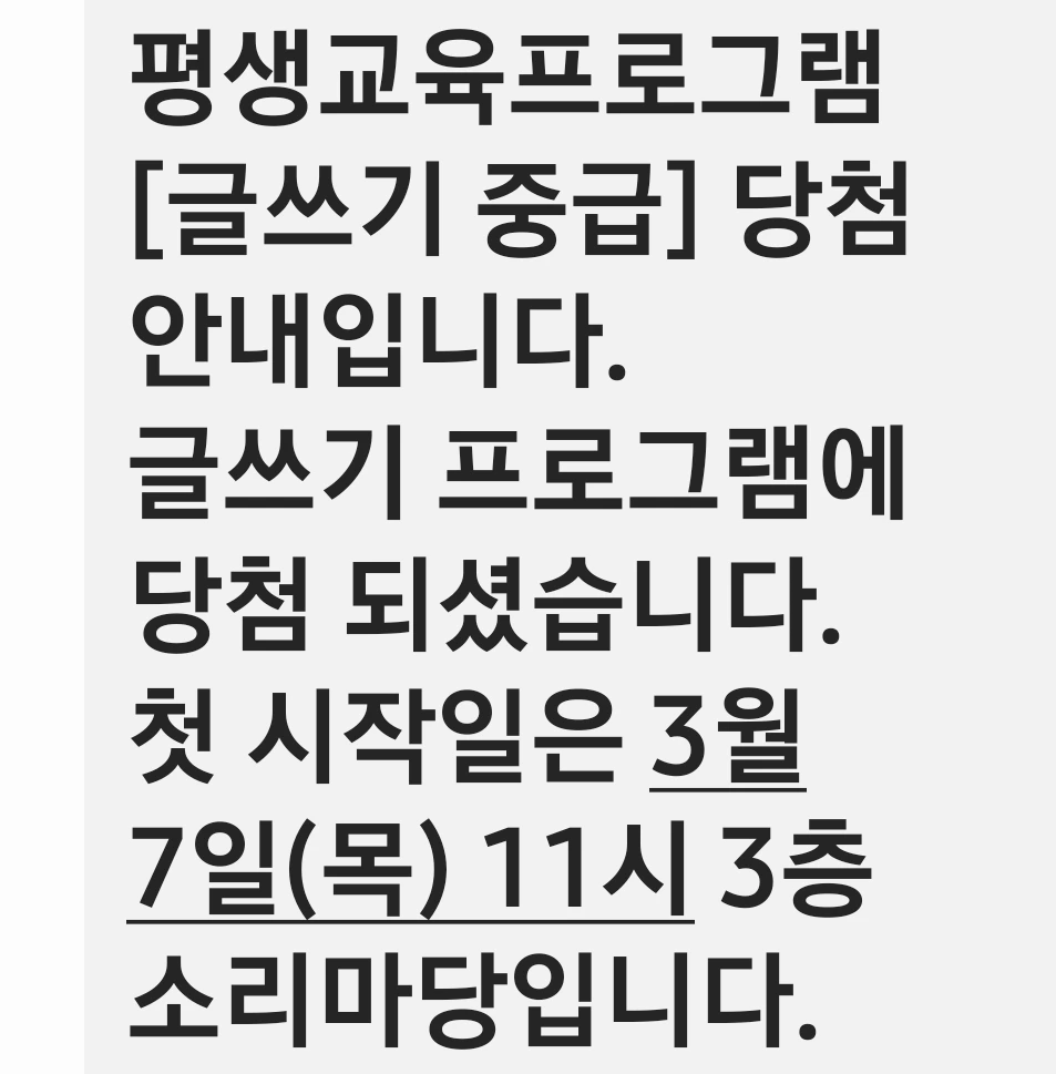 드디어 2월 27일, 기다리던 당첨자 발표 날이다. 아침부터 핸드폰을 손에 쥐고 문자를 수시로 확인하였다. 핸드폰에 알림이 올 때마다 열어보았는데 10시에 문자가 왔다. 세 과목을 신청했으나 그중에 한 과목이라도 되면 좋겠다고 생각했다.
