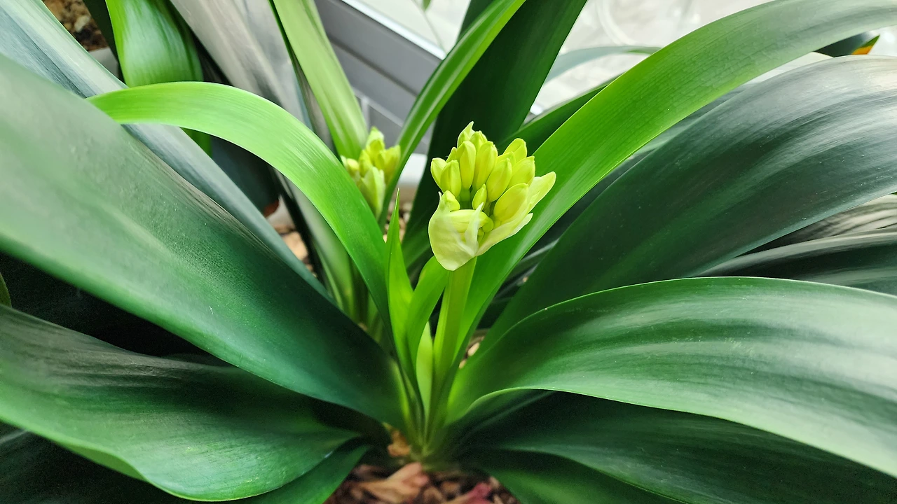군자란 잎 가장 가운데에서 손 내밀며
