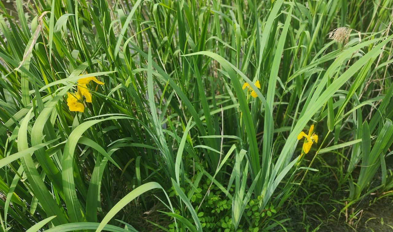 걷다 보니 3.5킬로 미터 지점까지 왔다. 중간에 쉬지 않고 걷으니 1시간 10분 정도 걸렸다. 왕복 7킬로미터가 넘으니 왕복하는 데는 2시간이 더 걸린다. 유수지 생태연못이 어리연으로 덮여있었다. 가장자리에 노랑꽃창포도 피어있었고 수련도 보였다. 연못을 한 바퀴 돌고 정자에 앉아서 쉬었다. 백련사에도 올라가 전망대에서 바다를 보면 좋을 텐데 남편이 무릎이 아파서 가지 못했다.