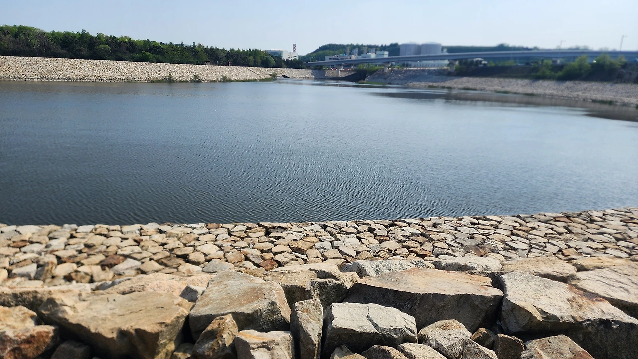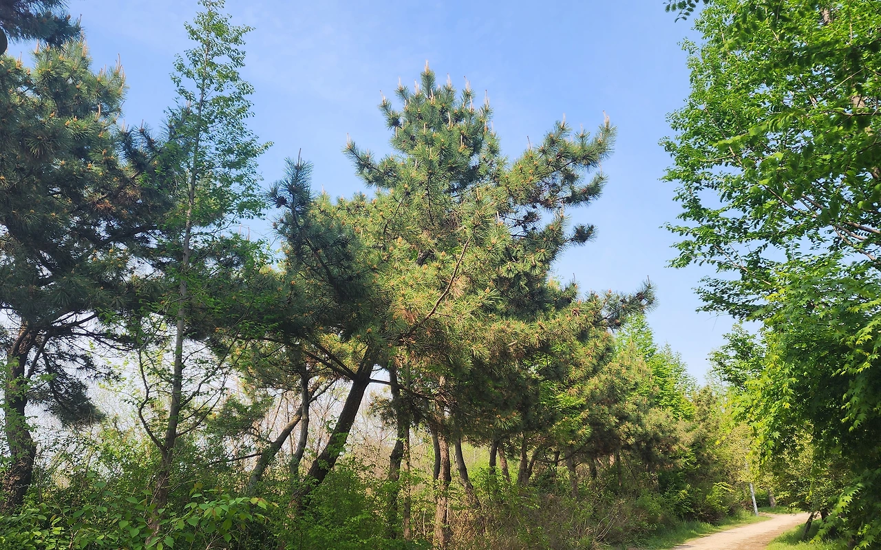 걷다 보면 갈림길이 나온다. 지난번에는 오른쪽 길로 갔는데 오늘은 왼쪽 길로 가 보았다.돌아올 때 반대편 길로 오면 된다. 가다 보니 유수지 옆길이라 소나무가 방풍목으로 심겨 있어서 노란 송화를 볼 수 있었고, 소나무길이 꽤 길게 이어져서 좋았다. 유수지 철새를 볼 수 있는 철새 관찰 조망대가 두 군데 있었는데 망원경도 설치되어 있었다. 유수지가 너무 커서 놀랐다.