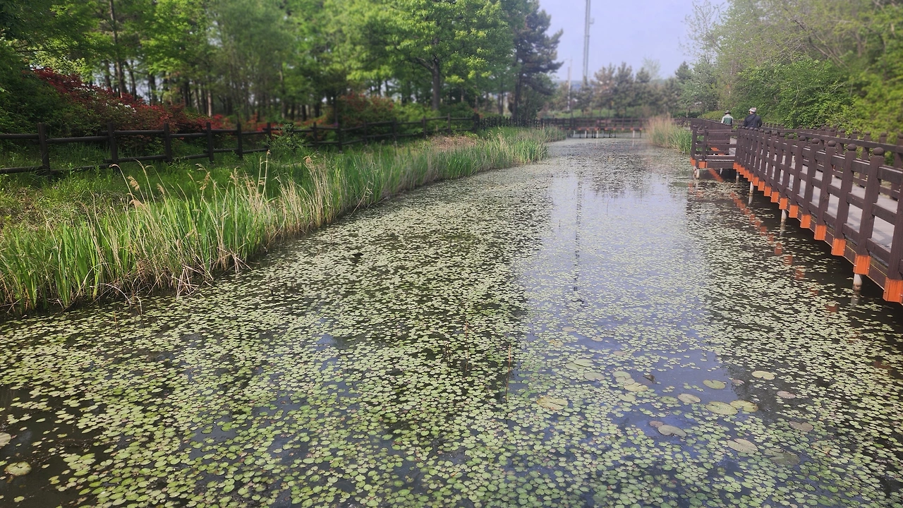 오늘 남편과 끝에 있는 유수지 생태연못까지 걸어가기로 했다. 산책길이 끝까지 평지라서 어르신들도 충분히 걸을 수 있다. 남편도 요즘 무릎이 아픈데도 끝까지 걸었다. 길에는 야자 매트가 반 정도 깔려있고, 반 정도는 흙길이거나 전체가 흙길만 있어서 아예 신발을 벗고 맨발로 걷는 분들도 있었다. 숲길이라 덥지 않아서선글라스를 안 써도 될 정도로 그늘이 져서 시원하게 느껴진다.