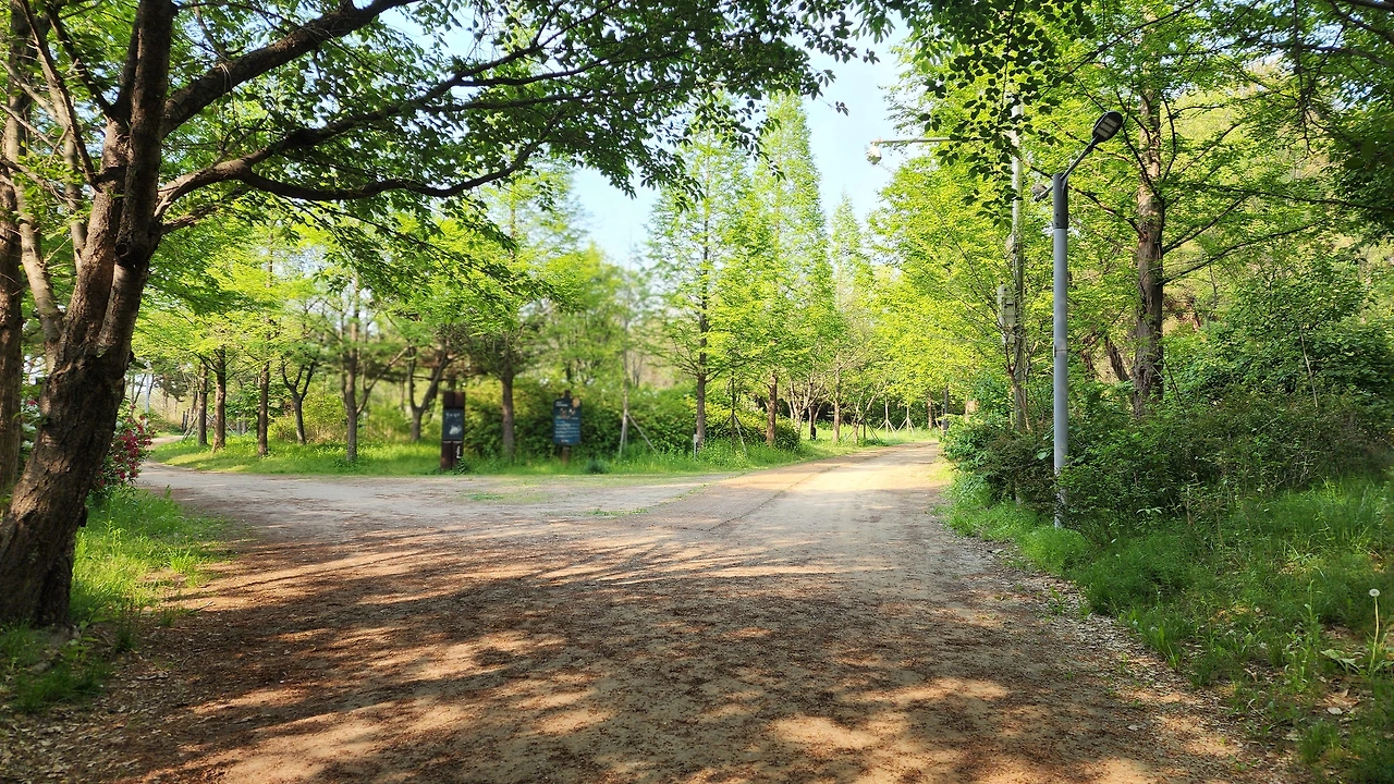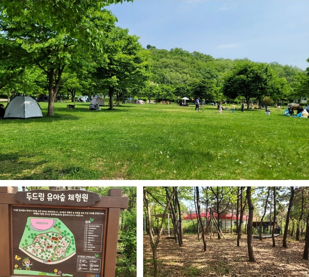 돌아가는 길에 보니 넓은 잔디 광장 나무 그늘에 텐트를 치고 있는 모습도 보였다. 돗자리를 펴고 가족과 쉬는 모습은 참 한가로워 보인다. 숲 속에 체험할 수 있는 유아 체험원도 있었다. 아이들 데리고 와서 잔디밭에서 뛰어놀게 하면 좋겠다고 생각했다. 지난가을에 다섯 살 쌍둥이 손자를 데리고 왔었는데 다리 아프다고 해서 입구 1.5킬로미터 지점에서 간식만 먹고 돌아간 적이 있었다. 다음에는 킥보드라도 챙겨서 잔디 광장까지 꼭 데리고 와봐야겠다.