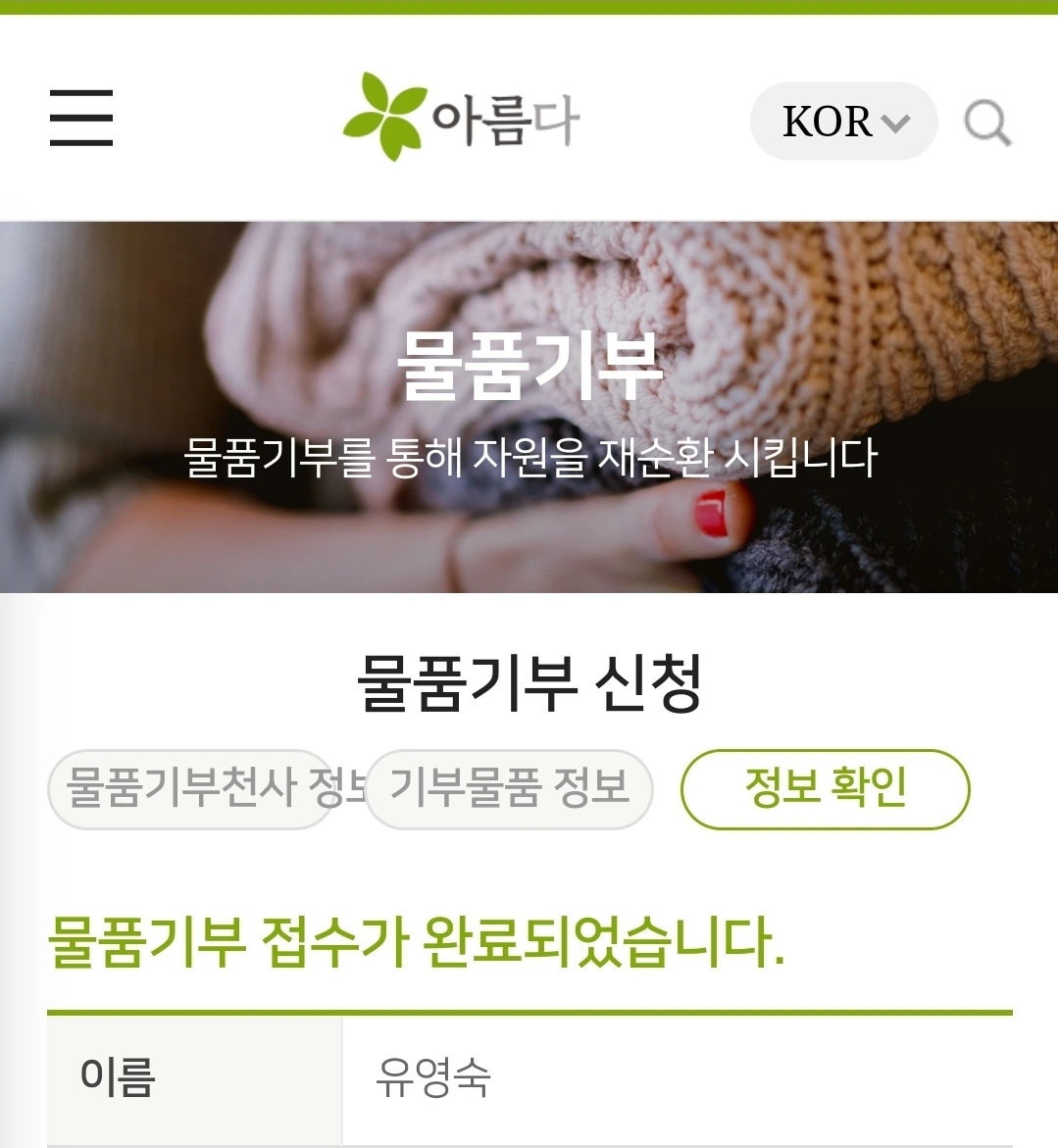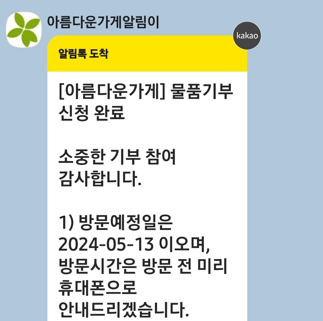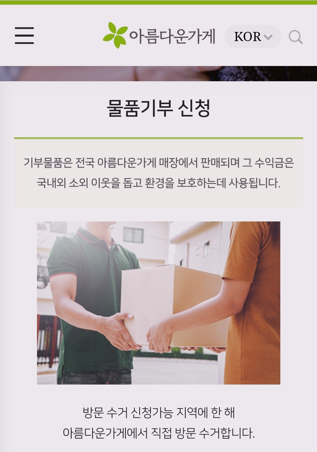 아름다운 가게 물품 기부 사이트에 들어가서 본인 인증을 하고 순서에 맞게 기부 신청을 하였다. 아름다운 가게에 물건을 기부할 때 세 상자가 넘으면 직접 방문해서 수거해간다. 오기 전에 문자가 오면 현관 밖에 내놓으면 된다. 너무 큰 상자에 담아서 들 수 없게 만들면 안 된다. 사람이 들 수 있어야 한다.