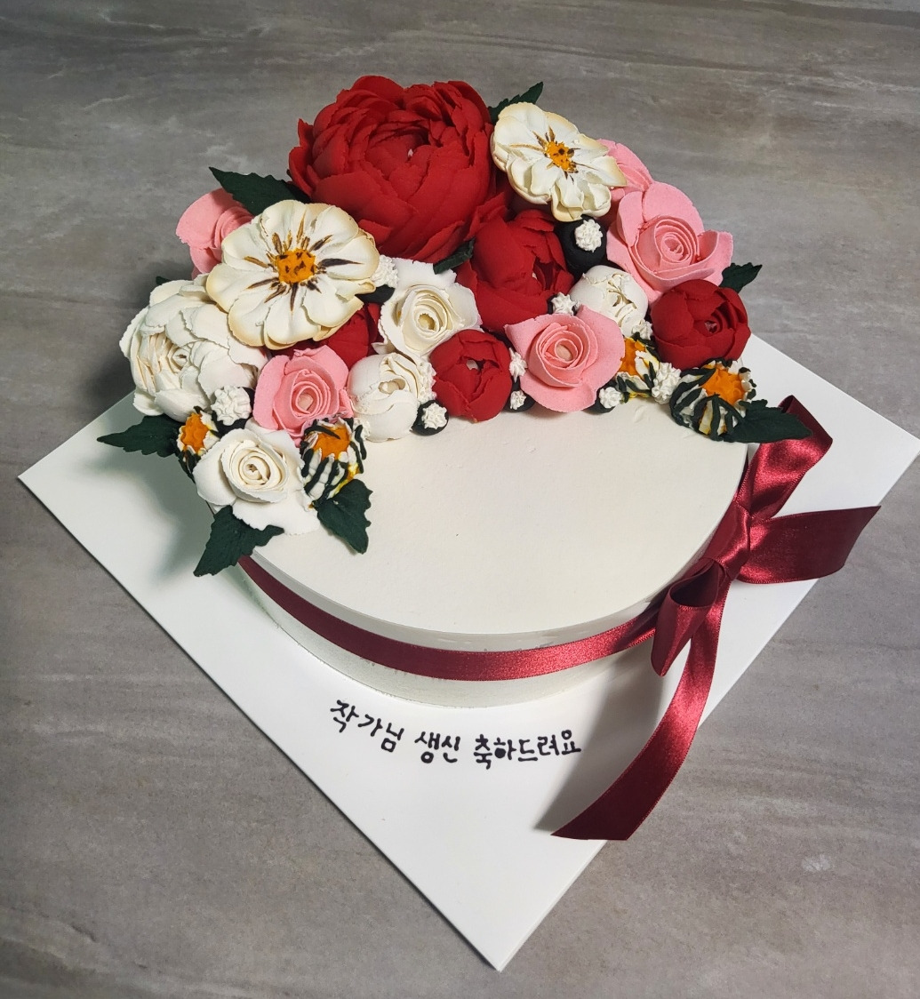 떡 케이크를 맞추어 왔는데 그렇게 예쁜 케이크는 처음 보았다. 며느리 센스가 돋보인다. 내가 에세이집을 출간한 작가이고 브런치 스토리에서 작가로 불리고 있어서 며느리가 '어머님' 대신 '작가님'으로 축하 메시지를 넣어서 모두를 행복하게 만들었다.