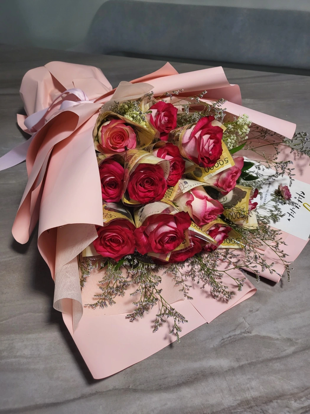 생일 축하 노래를 부르고 손자들과 촛불을 껐는데 남편이 숨겨놓았던 꽃다발을 들고 나와서 깜짝 이벤트를 해 주었다. 꽃다발이 평범한 꽃다발이 아니라 꽃을 돈으로 싸서 만든 돈꽃다발이었다. 올해 만 65세로 노인 반열에 들었다고 장미꽃 13송이를 5만 원으로 싸서 65만 원 돈꽃다발을 만들어 온 거다.