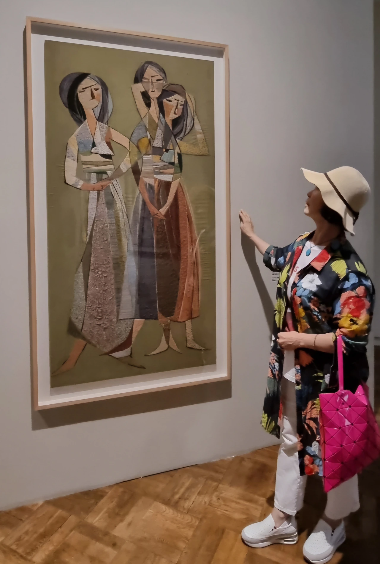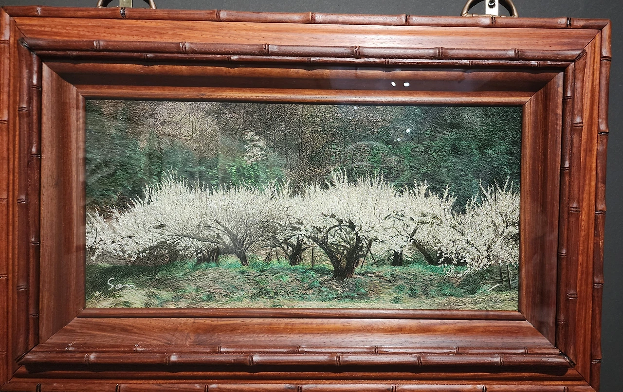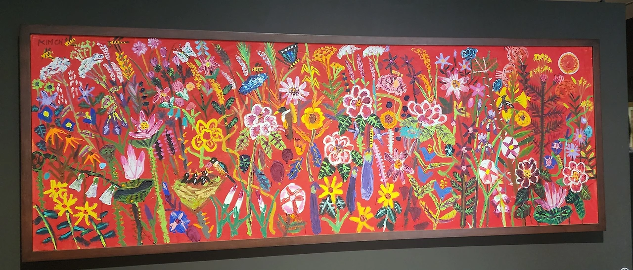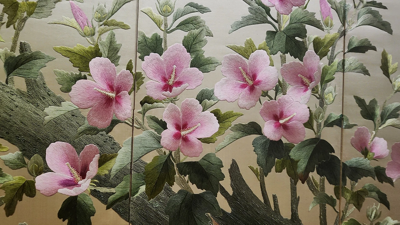 전시실은 조금 어두웠다. 자수 작품이 빛에 손상되는 것을 막기 위해서 실내 조도를 낮추었다고 한다. 그런 의미로 입구에 있는 작품은 자수가 아닌 그림이다. 가까이에서 보다가 작품을 훼손할까 봐 포토라인을 쳐 놓았다. 작품이 그림인지 자수인지 구분이 안되어 나도 자꾸 가까이에서 확인하려고 다가가게 되었다. 줄을 쳐 놓은 이유가 있었다.