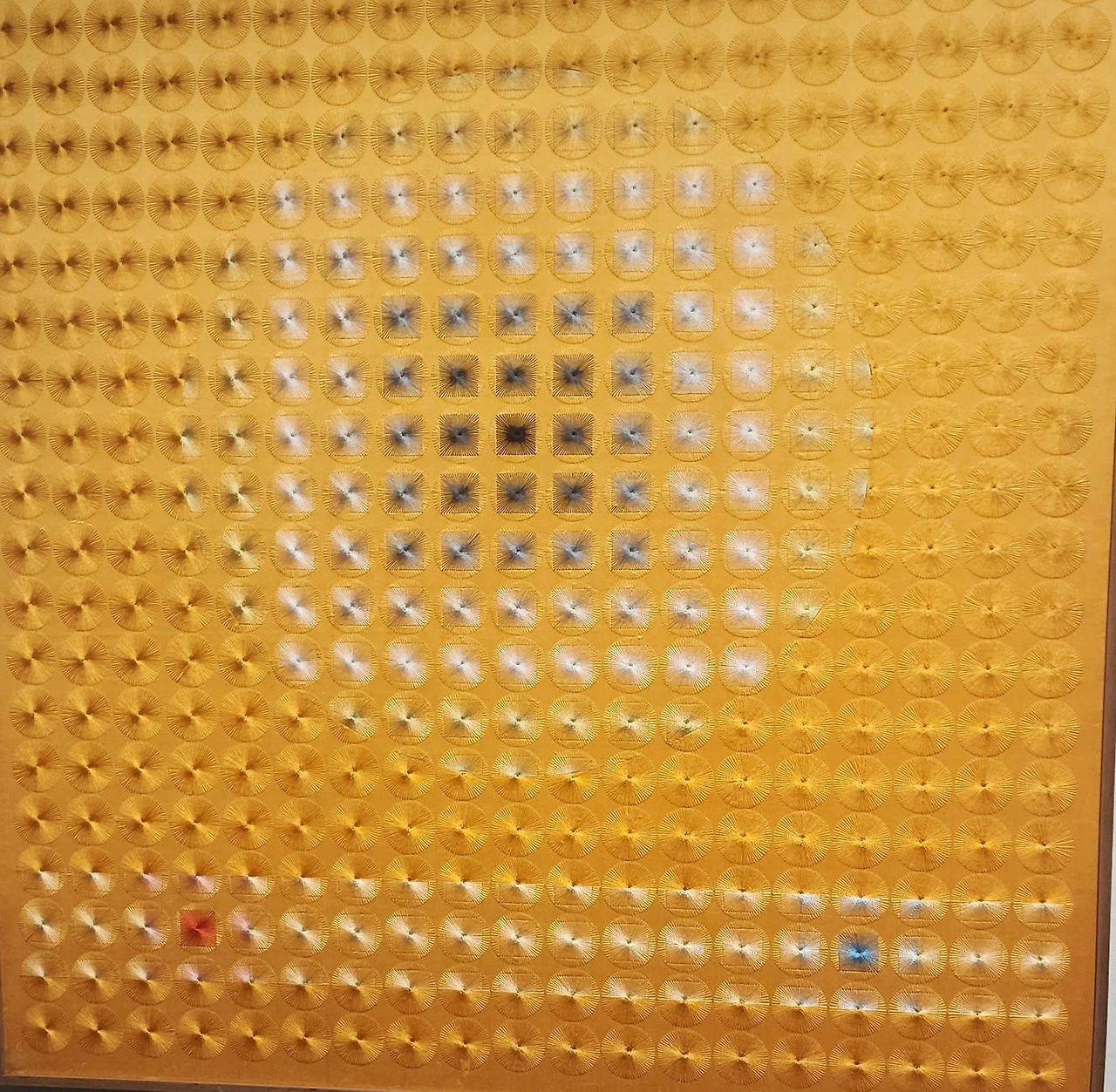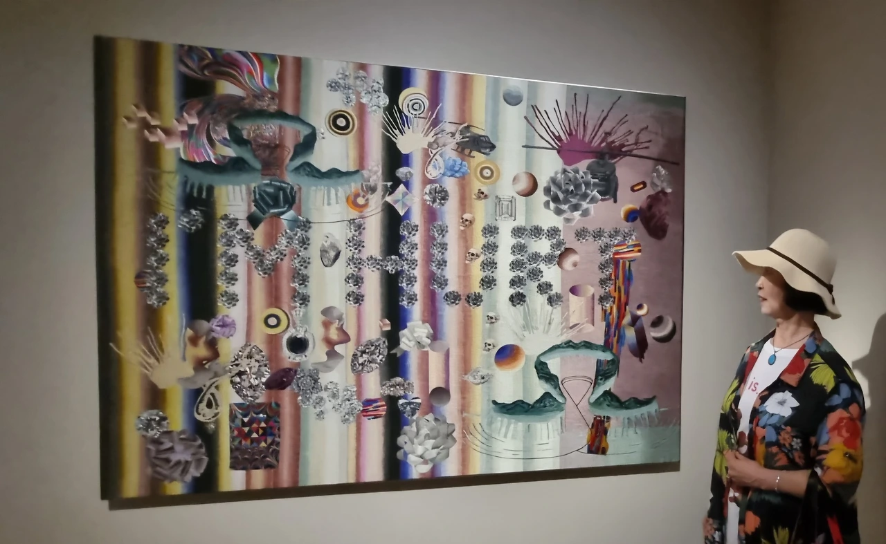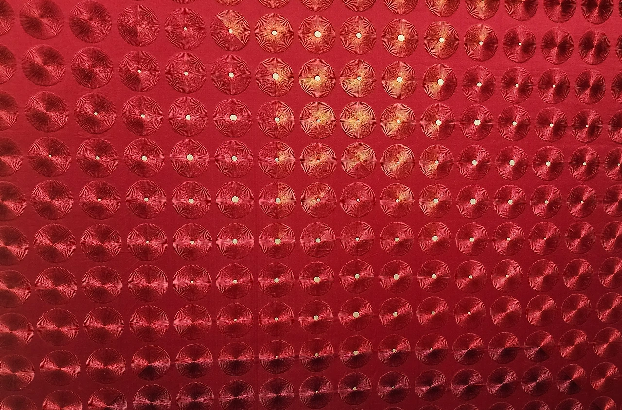 전시실은 조금 어두웠다. 자수 작품이 빛에 손상되는 것을 막기 위해서 실내 조도를 낮추었다고 한다. 그런 의미로 입구에 있는 작품은 자수가 아닌 그림이다. 가까이에서 보다가 작품을 훼손할까 봐 포토라인을 쳐 놓았다. 작품이 그림인지 자수인지 구분이 안되어 나도 자꾸 가까이에서 확인하려고 다가가게 되었다. 줄을 쳐 놓은 이유가 있었다.