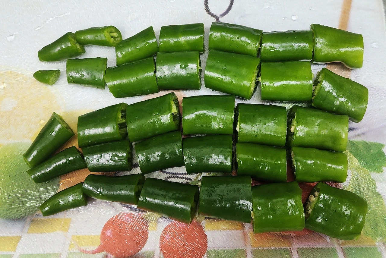 1. 오이고추 다섯 개를 깨끗하게 씻어서 먹기 좋게 자른다.