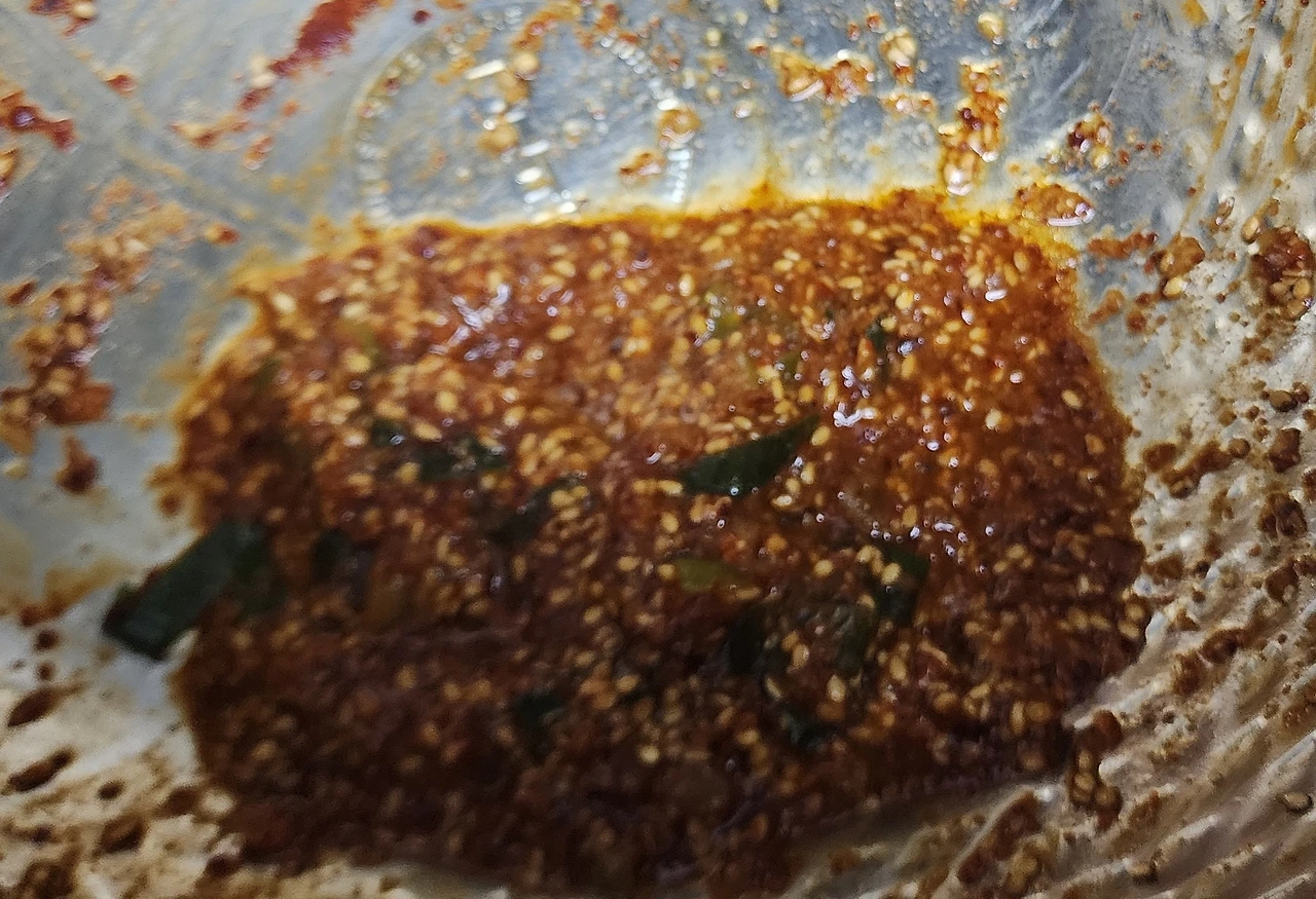 3. 가지가 익는 동안 양념장을 만든다. 국간장과 진간장을 각각 한 숟가락씩 넣는다. 국간장을 너무 많이 넣으면 짤 수 있어서 반 수저라고 생각하고 따른다. 고춧가루 한 숟가락, 들기름(또는 참기름) 한 숟가락, 맛술 한 숟가락(맛술 대신 설탕을 조금 넣어도 된다), 간 마늘 반 숟가락, 쪽파 썬 것 조금(홍고추가 있으면 조금 넣어도 색감이 예쁘다), 통깨(깻가루)를 모두 잘 섞어둔다.