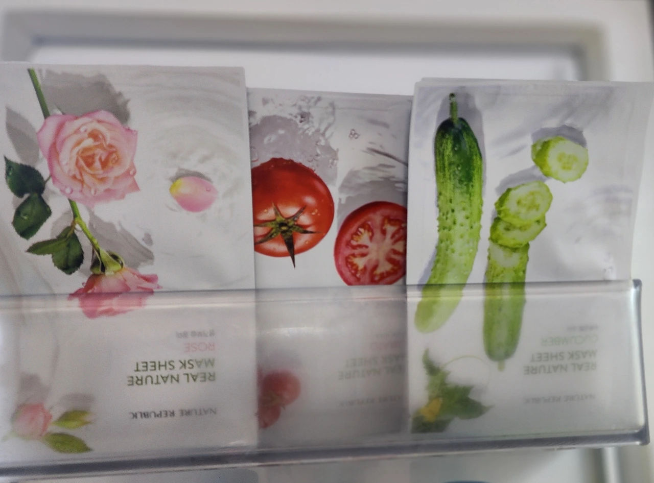 팩이 떨어질 때쯤 마트에 가서 팩을 종류별로 60개를 사 온다. 10개 한 묶음이라서 여섯 가지 팩이다. 수분진정, 미백, 영양, 보습, 탄력 등에 도움을 주는 팩을 골고루 사 온다. 매일 다른 팩을 사용하려고 하나씩 차례로 정리해서 냉장고 문 쪽에 넣어둔다.