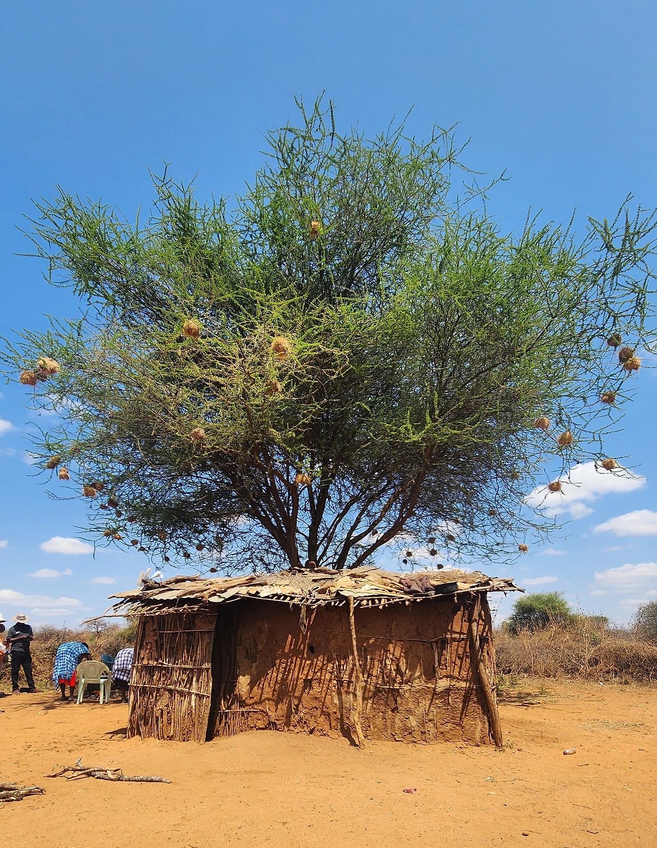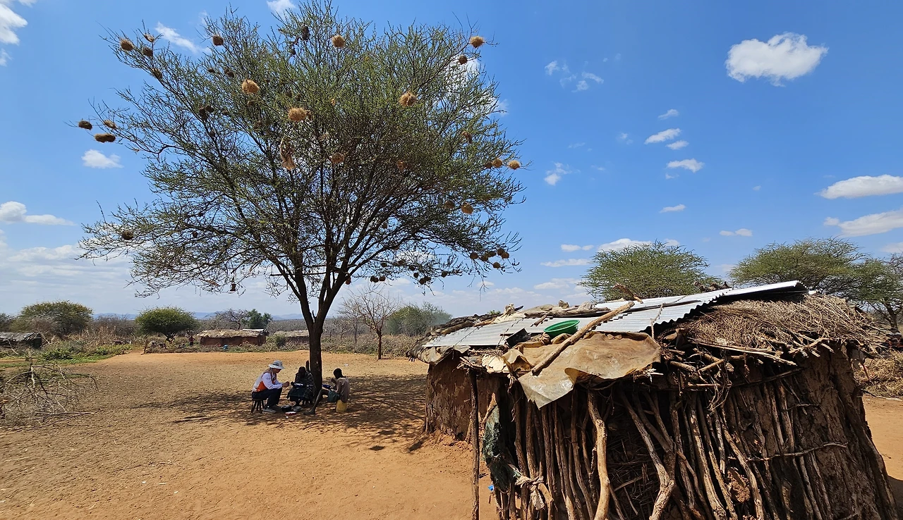 마을에는 집이 많지 않았는데 어디서 왔는지 40여 명의 마사이족 사람들이 모였다.아마 조금씩 떨어진 곳에 몇 가구씩 모여 살지 않을까 싶다.음식을 만들던 나무 밑에도 집 두 채가 있었다.나무에 열매처럼 주렁주렁 매달려있는 새집이 인상적이다.