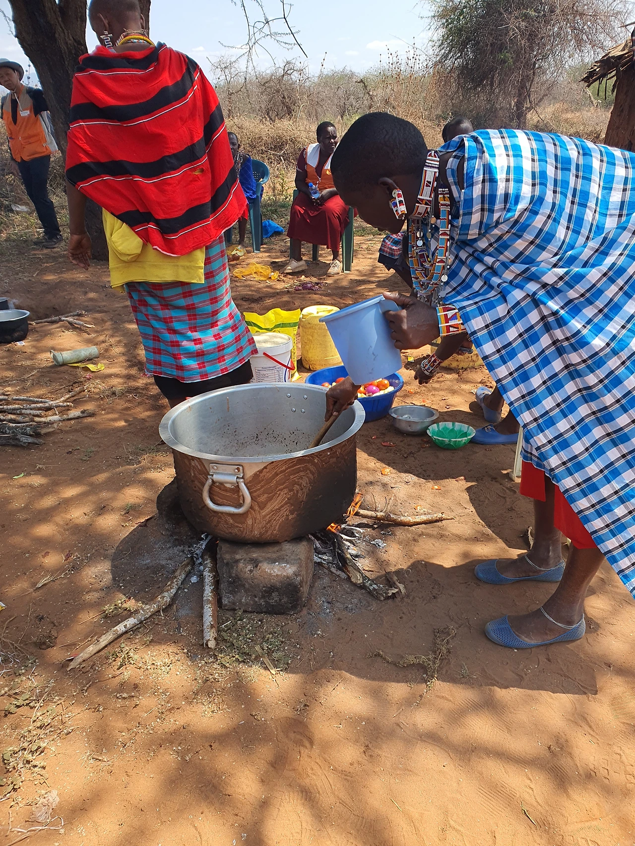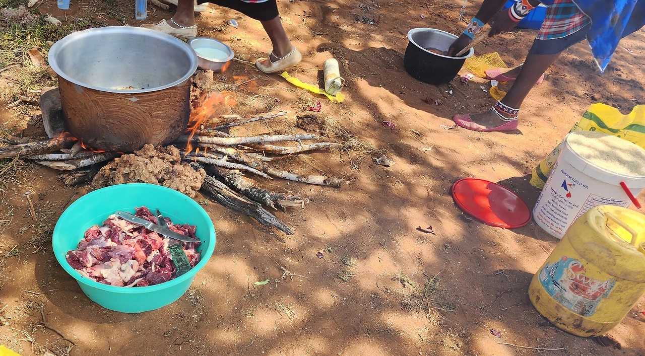 모인 사람들의 표정이 밝고 행복해 보였다. 나무 그늘에서 나뭇가지로 불을 피워서 음식을 만드는데 음식을 만들면서 화기애애한 분위기가 느껴졌다. 마사이 여인들이 외부에서 손님이 찾아왔다고 귀고리, 목걸이 등으로 장식하고 화려하게 차려입고 음식을 만들고 남자들은 그늘에 앉아 음식이 만들어지길 기다리는 풍경이 한가로워 보였다. 오늘은 이곳 마사이족 사람들도 배불리 먹을 수 있는 하루였다.
