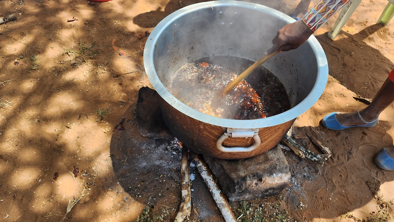 촬영 당일 우리가 준비해 간 음식 재료로 음식을 만들어 동네 사람들이 잔치를 벌였다. 감자와 콩 등을 볶아 소스를 만들고 쌀과 소고기를 넣어 만든 음식이다. 약간 소고기 야채죽 같은 느낌인데 마을 사람들이 한 그릇씩 나누어 먹었다.