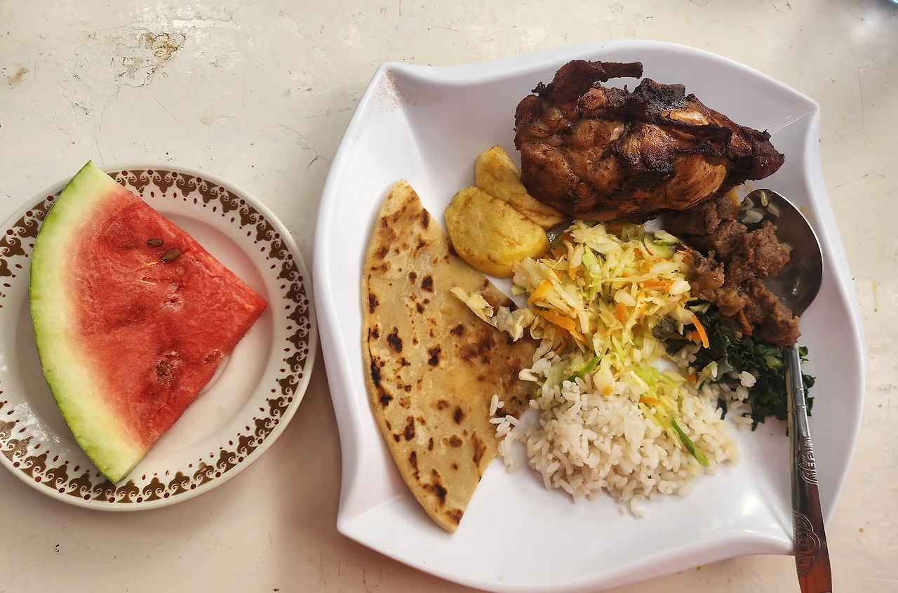 식당은 호텔 아침 뷔페처럼 몇 가지 음식이 놓여있었다. 옥수수 가루로 만든 백설기 같은 떡이 아프리카 전통음식이라고 했다. 별맛은 없었다. 치킨처럼 생긴 양고기 구이와 샐러드 등 몇 가지 음식을 담아서 먹었다. 호텔에서도 수박이 매일 나왔는데 이곳에서도 수박이 나왔다. 아프리카 수박은 물이 많지 않아서 그런지 약간 푸석한 느낌이었다.