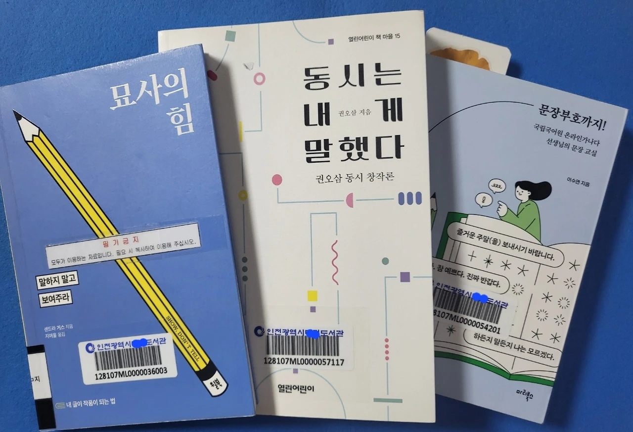 신청한 희망도서는 다음에 대출해서 읽어야겠다. 보고 싶었던 책을 검색했는데 이미 대출되어서 예약 신청하고 대신 다른 책 세 권을 대출했다. 세 권 다 글쓰기에 도움이 되는 책이다. <묘사의 힘>은 정이흔 작가님께서 소개해 준 책인데 도서관에 있어서 대출했다. 한 권은 신간도서에서, 또 한 권은 다른 서가에서 제목 보고 꺼냈다. 브런치에서 글 읽다가 작가님들께서 책 소개해주시면 읽어보고 싶은 책은 꼭 메모를 해둔다.