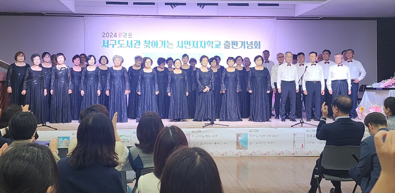 출판기념회는 식전 행사로 서구노인복지관 어르신 합창단의 합창으로 시작되었다. 나이 들어 머리가 희끗희끗한 분들도 계셨는데 검정 긴 드레스를 입은 여성 시니어들이 정말 아름다웠다. 여성보다 인원은 적었으나 흰색 턱시도에 나비넥타이를 한 남성 시니어분들도 멋있었다.