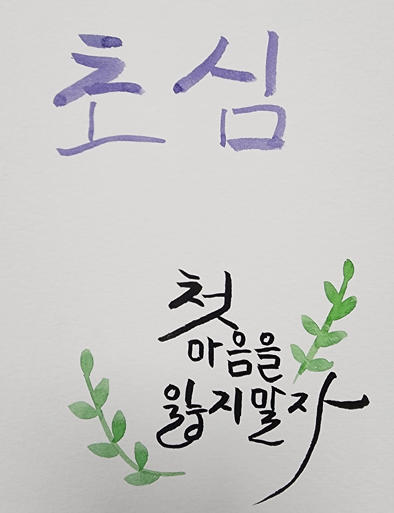 초심'을 주제로 수업했다. '초심' 하면 떠오르는 글을 쓰고, 그림도 그려 넣는 것이었다. 글도 다양하게 배치하는 연습을 하였다.