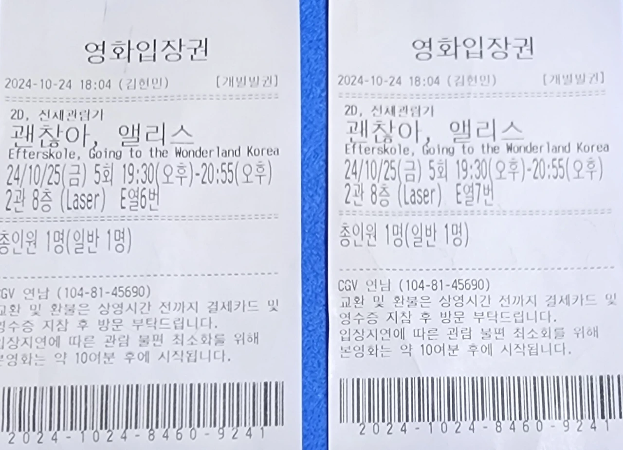 이번 영화는 오마이뉴스에서 제작한 《괜찮아, 앨리스》로 다큐멘터리 영화다. 수능 하루 전인 11월 13일부터 영화관 100여 곳에서 상영될 예정인데 그전에 여러 도시에서 시사회를 하는 중이다. 오마이뉴스 시민 기자로 활동하고 있어서 무료로 관람할 수 있어서 'CGV 연남'으로 신청했는데 당첨이 되었다.