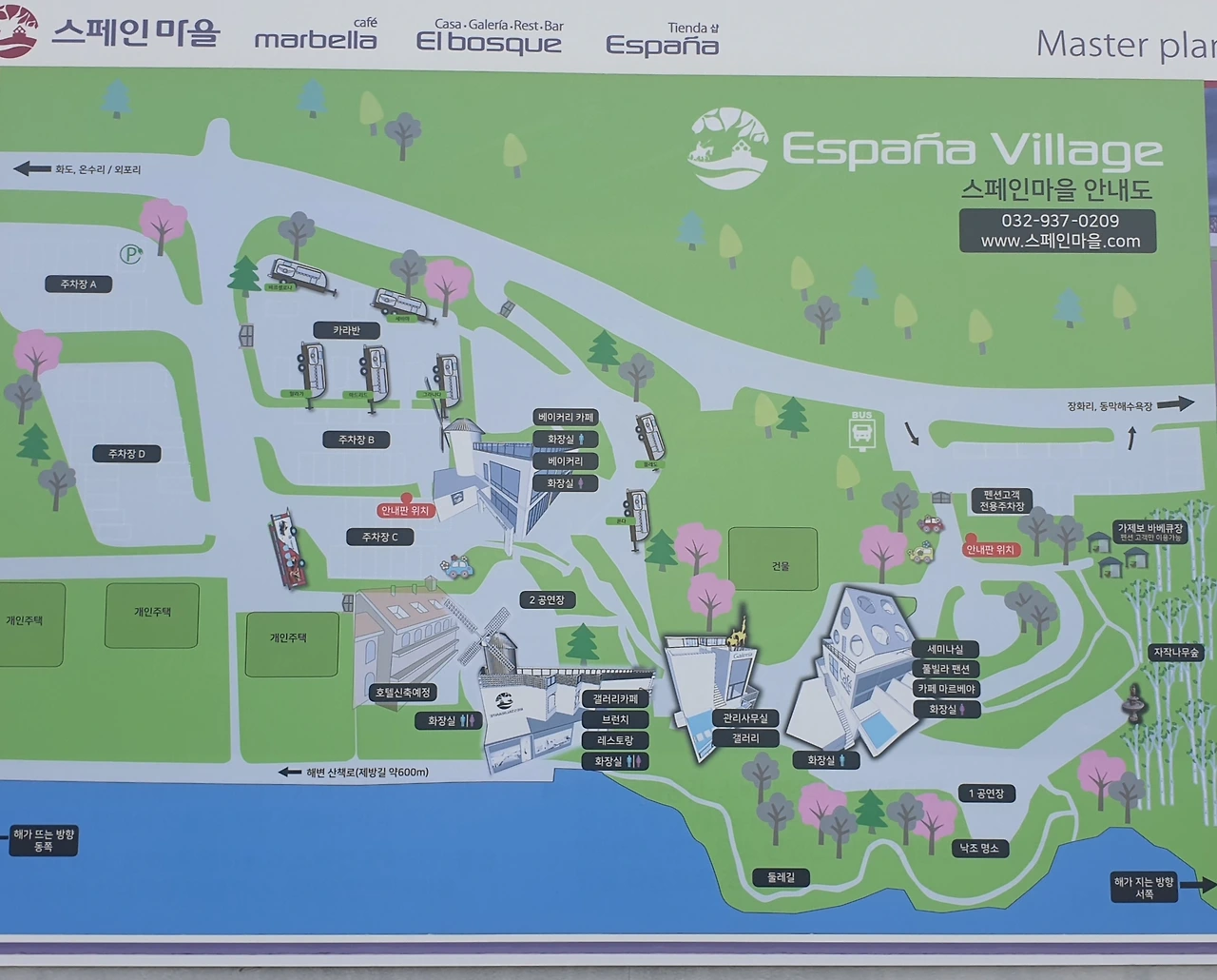 오후에 스페인 마을에 가서 기념사진도 찍고 갤러리에서 그림도 감상하며 즐거웠다. 바다가 보이는 곳에 위치한 스페인 마을은 미니 스페인이었다. 공간은 그리 넓지 않지만 아기자기하게 꾸며져 있어 날씨 좋은 날 가면 사진도 예쁘게 찍을 수 있겠다 싶었다. 중간중간 포토존도 있어서 방문객들을 배려했다는 생각도 들었다.
