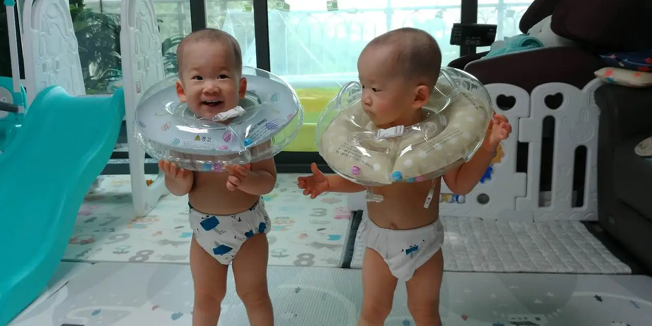 쌍둥이 손자 목에 목 튜브를 끼워주고 팬티만 입혀서 물에 넣어주었다. 잘할까 걱정했는데 쌍둥이 손자가 물속을 걸어 다니며 공과 장난감을 가지고 놀았다. 평소에 목욕하는 것을 좋아했기에 물을 좋아할 거라고 생각했는데 맞았다.