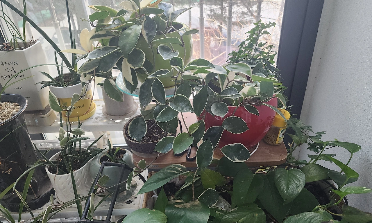 호야도 여름에 화분 하나가 거의 시들어서 다른 화분에 있는 호야 가지를 잘라 물꽂이 하였다가 뿌리가 나서 옮겨 심었는데 지금 화분 2개가 다 풍성하게 자랐다. 호야꽃은 별처럼 예뻐 힘든 시간을 보내는 요즈음 꽃을 피워주면 좋겠는데 아직 꽃이 필 기미는 보이지 않는다.