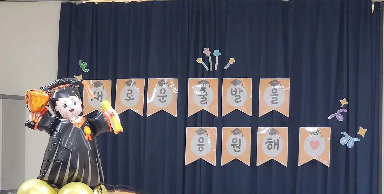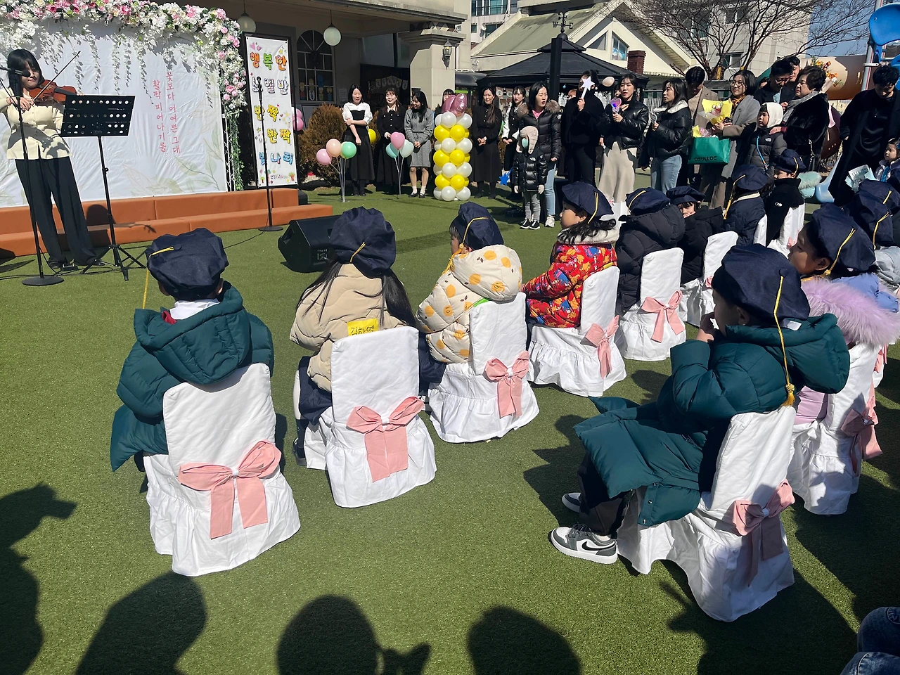 이제 유치원을 졸업하고 3월 4일에 초등학교에 입학할 쌍둥이 손자가 어찌나 대견한지 유치원 졸업 가운을 입은 손자가 자랑스러웠다. 폐회사를 마치며 2부 행사는 유치원 마당 특별 무대에서 진행되었다. 아직 바람도 불고 추웠지만, 특별한 날이니만큼 좋은 자리가 되었다.