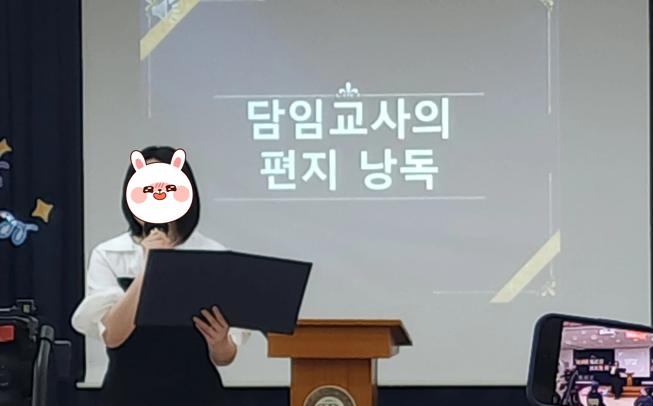 상장 수여가 끝나고 1년 동안 원아들과 함께 한 노벨반 담임선생님의 편지 낭독이 있었다. 유아들에게 고마운 점, 대견한 점, 헤어지기 아쉬운 마음 등을 동화처럼 낭독해 주었고 부모님께도 감사한 점 등을 말씀했는데 여자 유아들이 눈물을 훔치며 울었고, 뒤쪽에서 듣고 있던 엄마들이 한 분 두 분 눈물을 훔쳤다.