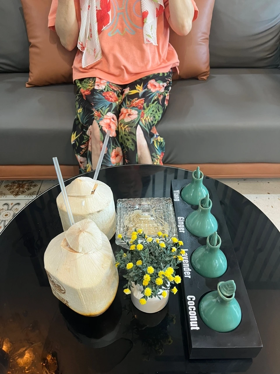 우리는 아로마 스톤 마사지를 받았다. 마사지받기 전에 아로마향, 집중적으로 받고 싶은 곳, 마사지 세기 등을 체크하였다. 여행 가서 마사지를 많이 받아보았는데 따뜻한 스톤으로 하는 마사지는 처음이었다. 90분 동안 정말 편안하고 시원하게 받았는데 아픈 곳이 풀리고 힐링이 되었다. 끝나고 주는 코코넛 워터도 좋았다.