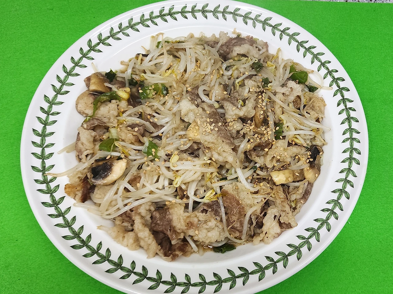차돌박이 고기를 볶은 후에 숙주나물과 양송이, 청경채 등 채소를 넣어 볶는데 요리 팁은 굴소스를 조금 넣는 것이라고 한다. 짜면 맛이 없어서 소금도 조금 넣어 심심하게 해야 한단다.