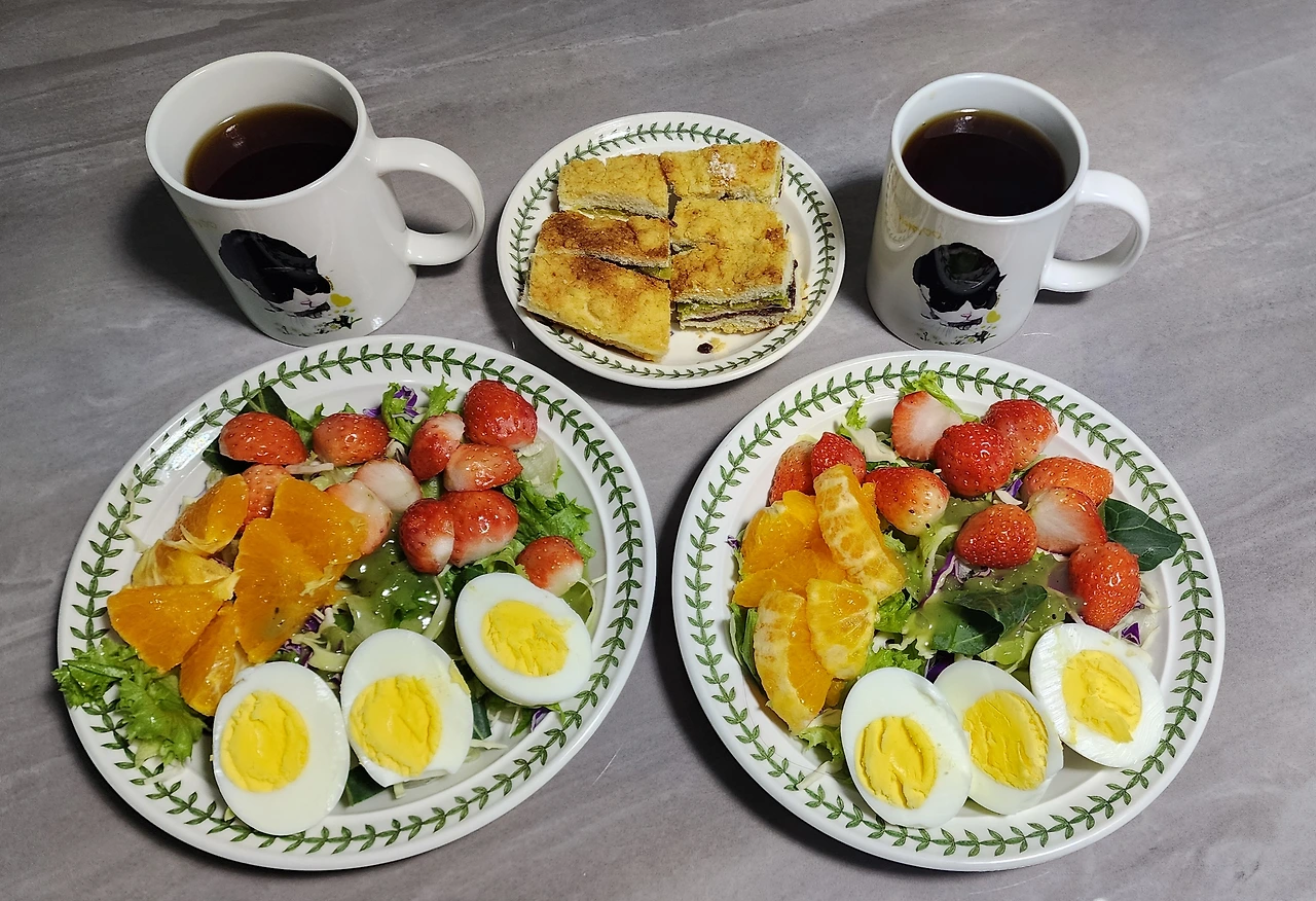 남편과 나는 아침은 밥보다 빵이나 떡을 좋아하는데 아침을 조금 늦게 과일과 샐러드까지 챙겨 먹으니 든든해서 하루에 두 끼만 먹게 된다. 달걀도 완숙과 반숙 중간으로 어쩜 그렇게 알맞게 잘 삶는지 매일 칭찬해 준다.