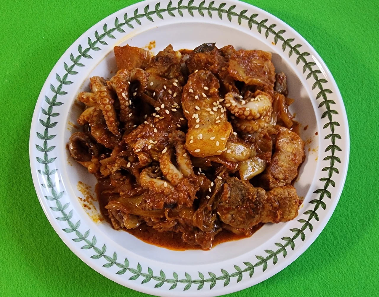주꾸미볶음에는 삼겹살을 추가하여 주꾸미 삼겹살 볶음을 만들었다. 삼겹살을 먼저 노릇노릇하게 굽고 밀키트 주꾸미볶음을 넣으니 근사한 주꾸미 삼겹살 볶음이 탄생했다. 삼겹살이 주꾸미와 잘 어울려서 그냥 주꾸미볶음보다 맛있었다.