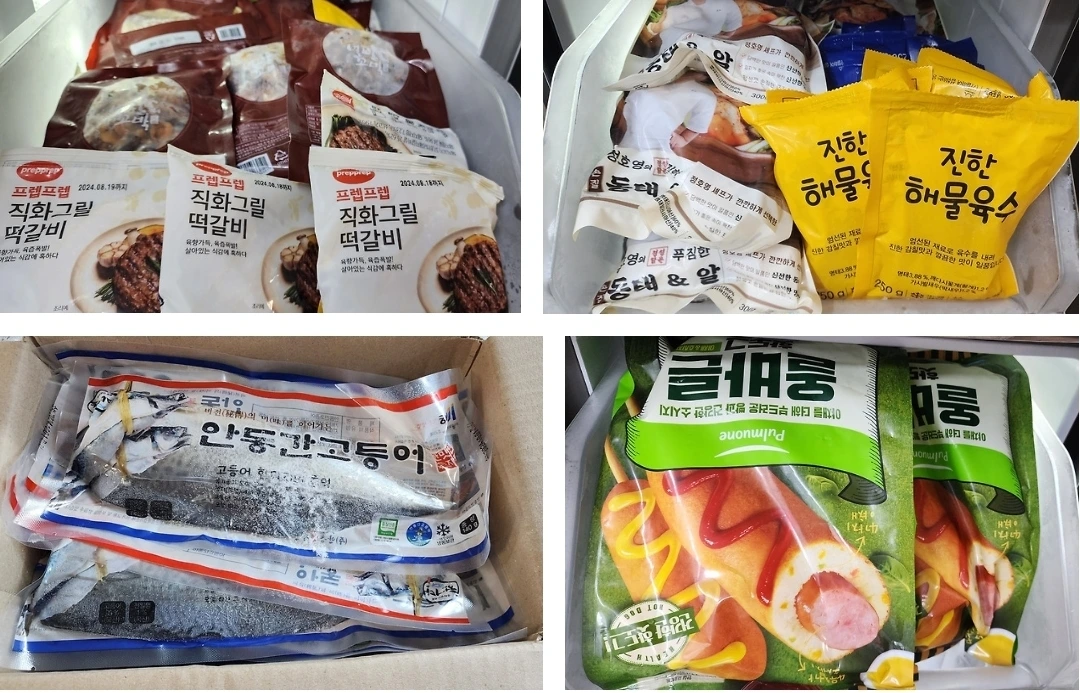 남편의 밀키트 사랑으로 우리 집 냉동실에는 늘 밀키트가 채워져 있다. 도가니탕을 비롯해서 알탕, 낙지볶음, 부대찌개 등 종류도 다양하다. 간식으로 먹는 핫도그와 손자를 위한 떡갈비도 있다.