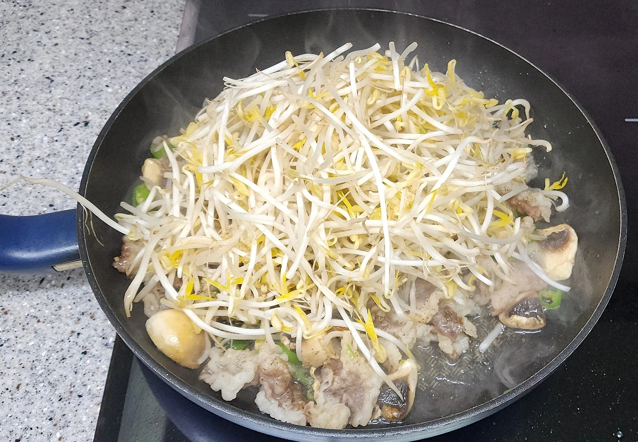 요리에 재미를 붙인 남편이 늘 밀키트만 활용하지는 않는다. 남편이 잘하는 요리 중에 숙주나물 차돌박이 볶음이 있는데 아들 며느리가 오는 날 자신 있게 만들어서 내놓는 요리다.