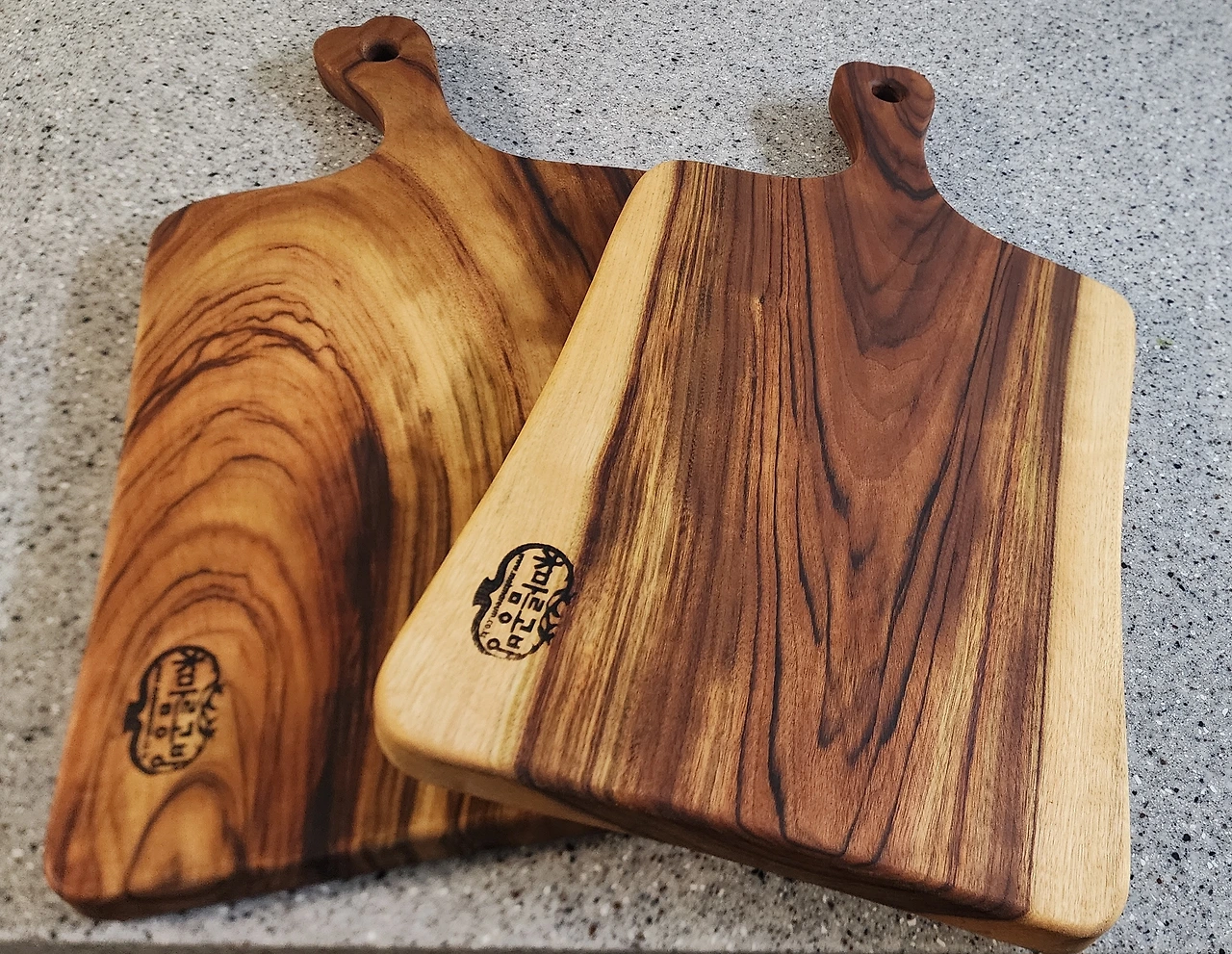 일주일 후에 목공방에 간 남편이 나무 도마 두 개를 자랑스럽게 들고 왔다. 만든 캄포 도마가 어찌나 매끄럽게 잘 만들어졌는지 멋진 예술 작품이었다. 예뻐서 어떻게 쓸까 며느리들이 고민이 될 것 같다.