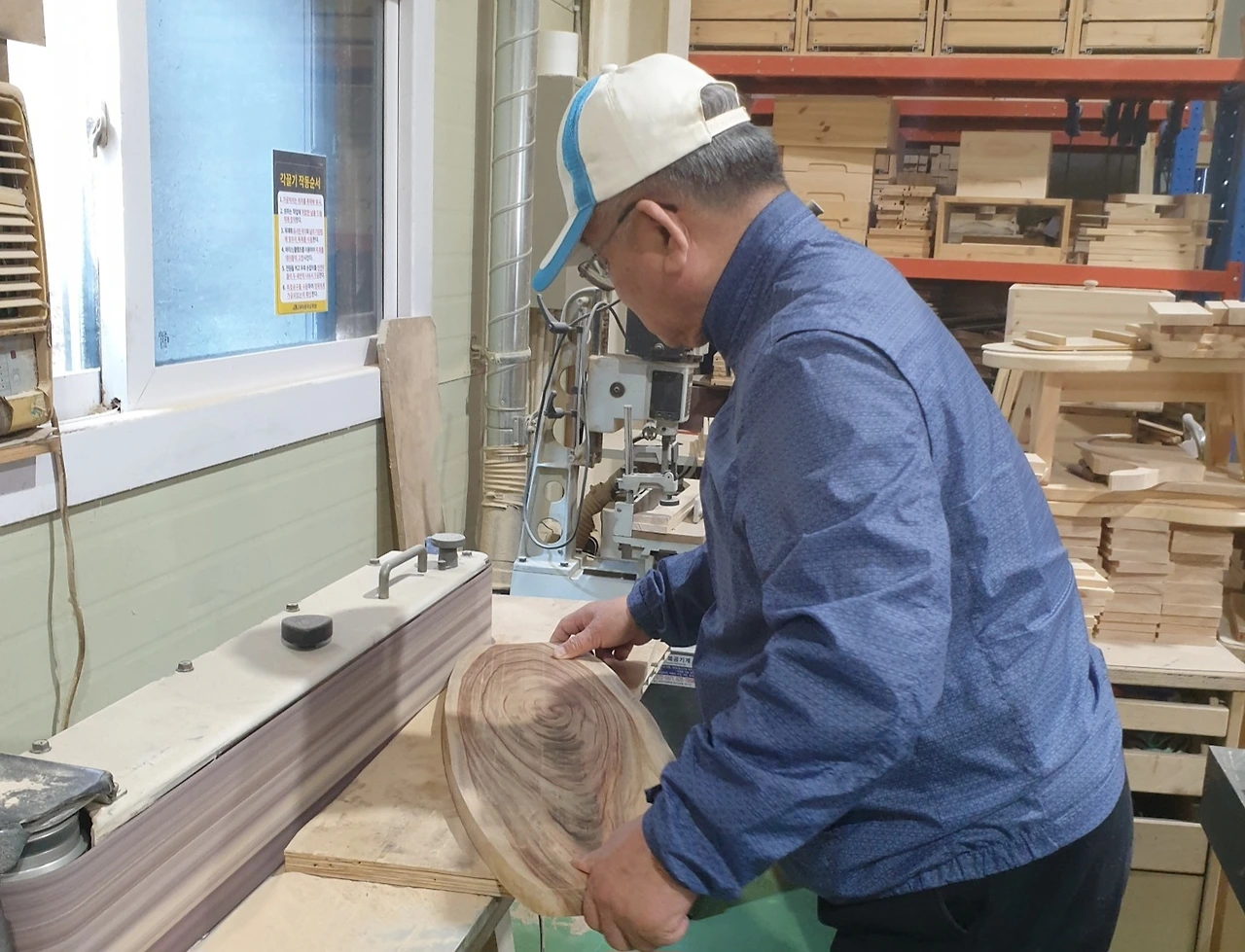 남편은 두 며느리에게 좋은 도마를 만들어 주고 싶은 마음에 나무를 직접 기계로 자르고, 전동 샌딩 머신과 톱 머신 등을 사용하여 제대로 작업을 하였단다. 이 과정에서 샌딩머신으로 도마를 매끄럽게 하는 도마 샌딩(사포질 같은 것)이 가장 힘들었다고 말한다.