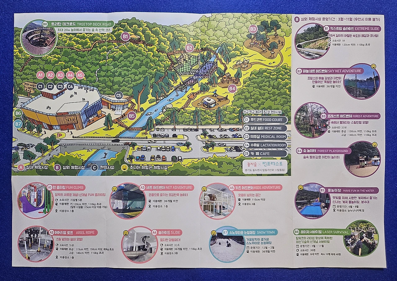 중요한 것은 '놀자 숲'을 이용하려면 반드시 운동화를 신어야 한다. 또한 대부분 체험에 키 제한이 있어서 최소 120cm 이상이면 좋고, 실외 놀이까지 제대로 즐기려면 130~140cm 이상이면 좋다. 다행히 우리 쌍둥이 손자 키는 120cm가 넘어서 체험할 수 있는 놀이 기구가 꽤 많았다.
