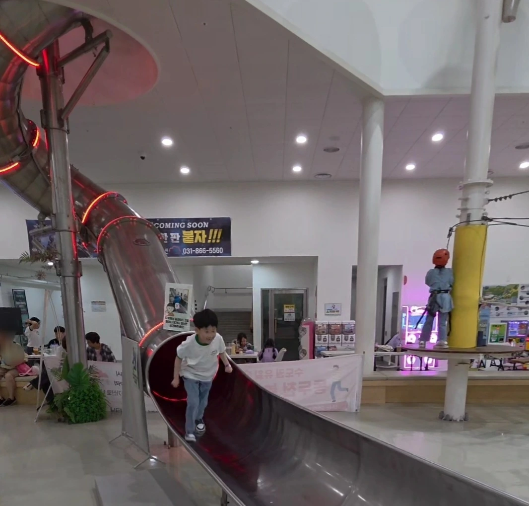 손자들은 먼저 네트 어드벤처에서 놀았다. 네트가 3층으로 되어 있었는데 중간중간 설치되어 있는 원통형 네트를 통해 층 이동이 가능하다. 다음에는 3층부터 타고 내려오는 실내 슬라이드에도 가뿐하게 도전했다. 네트에서 오르내리며 뛰어노느라 땀범벅인데도 재밌다며 계속 노는 손자들 에너지가 놀라웠다.