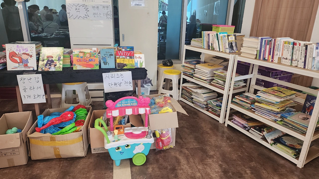 바자회 당일에 남편과 쌍둥이 손자를 데리고 개장하는 10시 전에 도착했다. 추석이 가까워서 추석에 먹으려고 김치와 수제 된장, 구운 김, 매실액 등을 사고 이제 손자들을 데리고 장난감 코너에 갔다. 정말 장난감과 인형류가 산처럼 쌓여있었다.