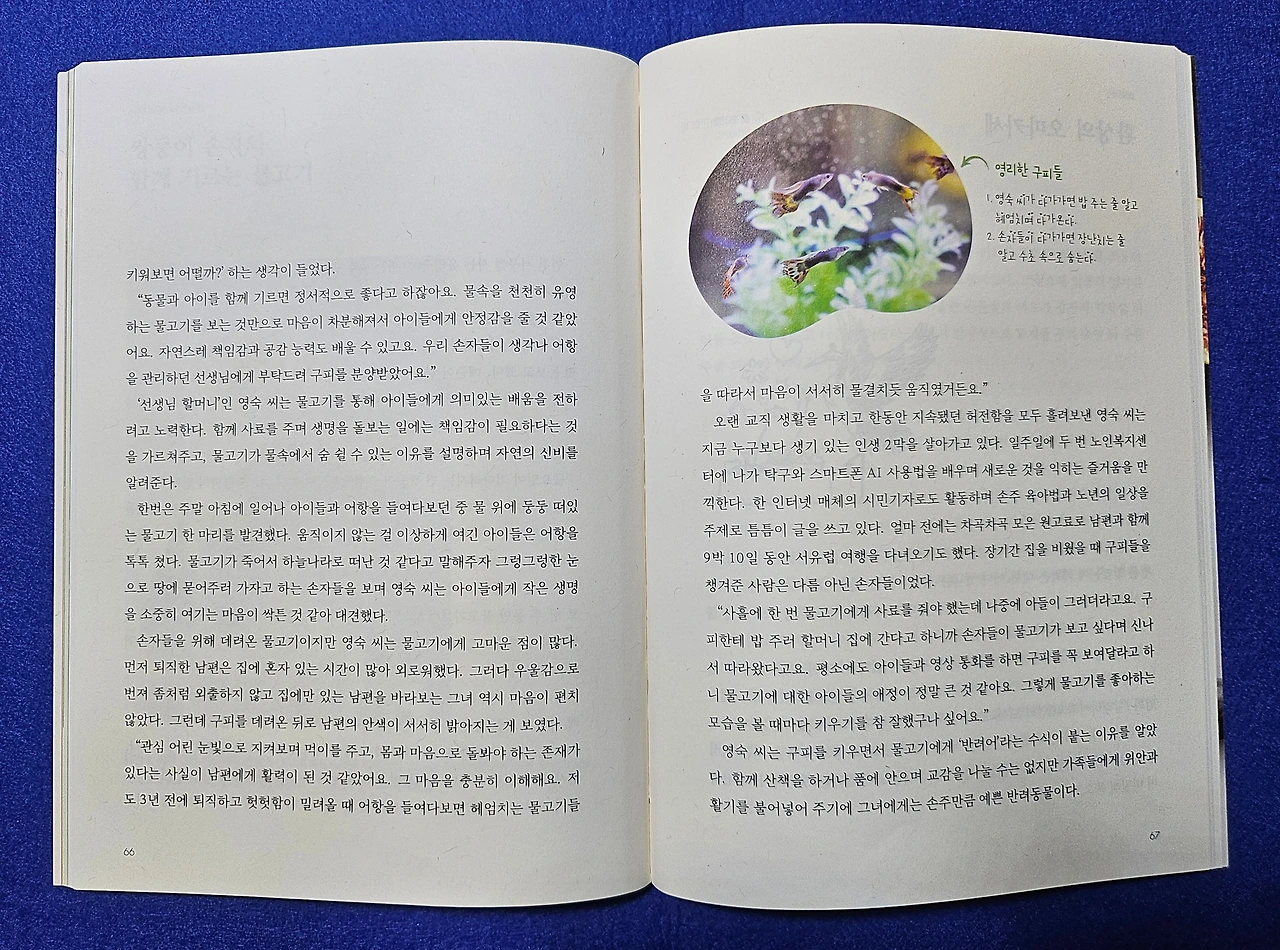 9월 29일에 월간 <샘터> 기자와 인터뷰는 자연스럽게 이루어졌다. 인터뷰하는 동안 사진작가님께서 사진을 찍으셨고, 인터뷰 후에도 구피 어항 주변에서 사진을 찍었다. 구피를 분양해서 구피 수가 많지 않아서 조금 미안했다. 인터뷰 후에 기사가 어떻게 쓰였을지, 어떤 사진이 실릴지 궁금하여 11월이 기다려졌다.
